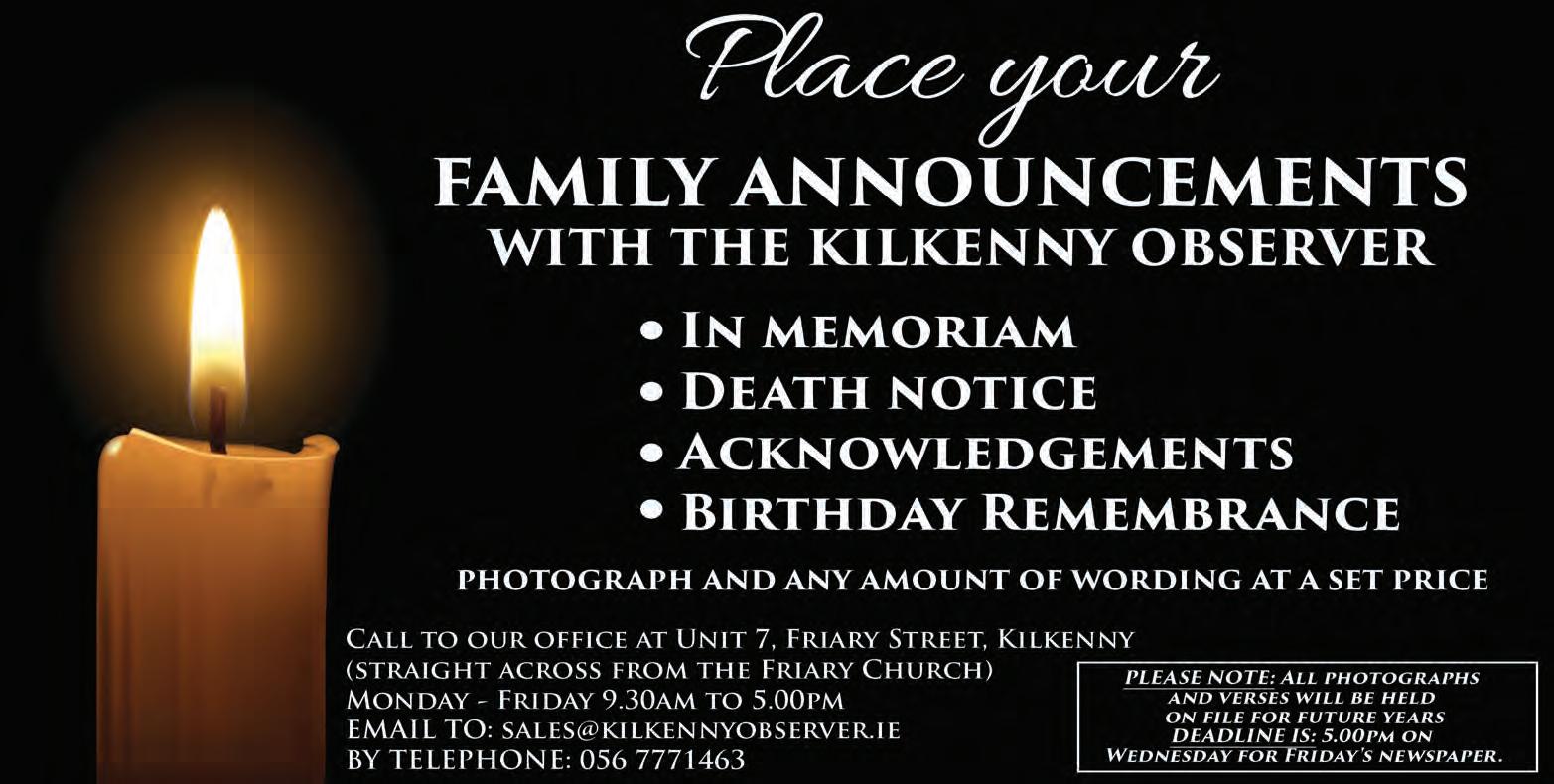 The Annual Memorial Mass at St Luke’s General Hospital, in memory of patients who have died at the hospital in the past year, will take place on Tuesday, October 21 at 7.30pm. The annual mass will take place in St Canice’s Parish Church, Kilkenny. The Hospital’s End of life Care committee is inviting all those who wish to remember patients who have died at the hospital from September 1, 2024 to August 31, 2025 to come to the service to remember their loved ones. The service will be streamed live from via webcame at www.stcanicesparish.ie. See also Page 6
