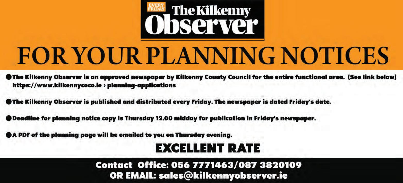 The planning application may be inspected, or purchased at a fee not exceeding the reasonable cost of making a copy, at the offices of the Planning Department, Kilkenny County Council, County Hall, John Street, Kilkenny, during its public opening hours 9 a.m.- 1.00 p.m. and 2.00 p.m. – 4.00 p.m. Monday to Friday, and a submission or observation in relation to the application may be made to the Planning Authority in writing on payment of the prescribed fee (€20.00) within the period of 5 weeks beginning on the date of receipt by the Authority of the planning application, and such submissions or observations will be considered by the Planning Authority in making a decision on the application. The Planning Authority may grant permission subject to or without conditions, or may refuse to grant permission.