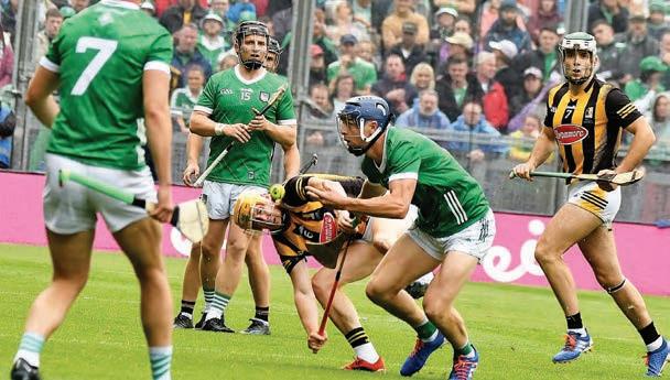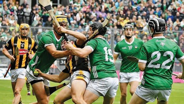 out on their feet both physically and mentally. ey just didn’t have the resolve to halt the green tide. After a false start, Saturday’s groom, Cillian Buckley was thrown on to try and shackle the rampant Treaty attack, but it would be a Limerick sub that notched the next point in the shape of Cathal O’Neill. Richie Hogan was sprung from the bench, for what may well be his last appearance in the black and amber of his beloved Kilkenny. Dromin’s David Reidy then pointed as the gap grew to eight. Five minutes of normal time remaining, but it looked like the Cats belief had been crushed.
