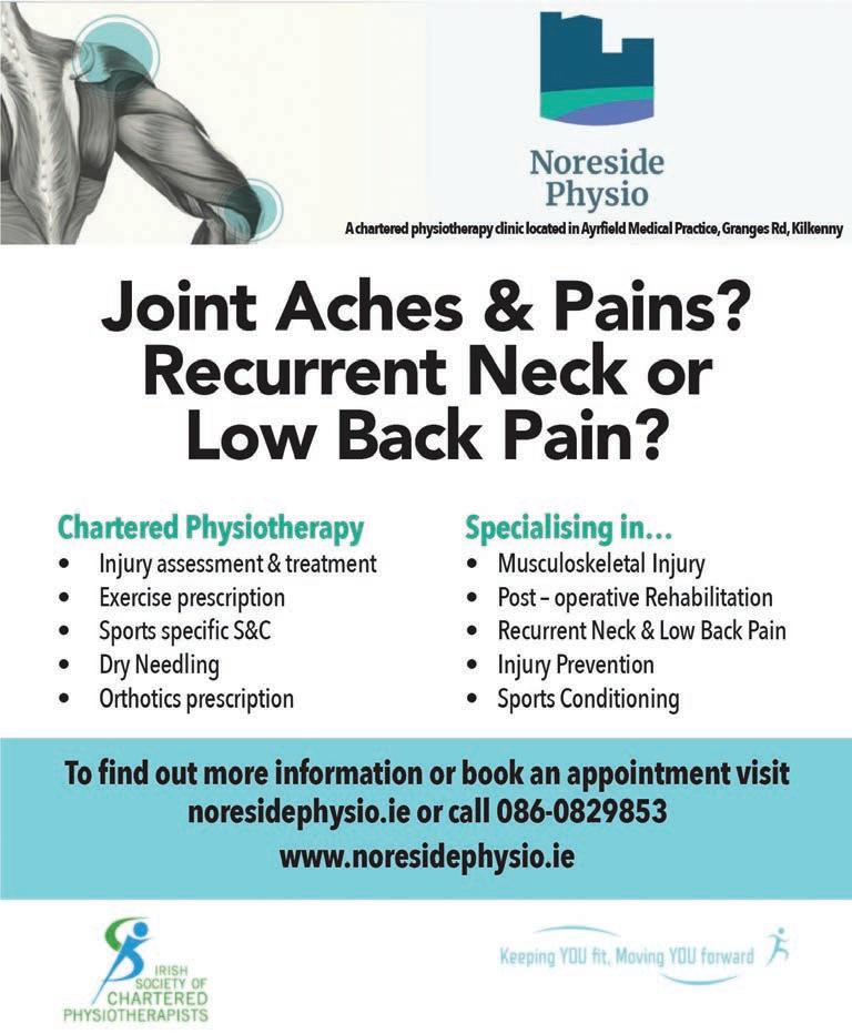 Timmy Cli ord, perhaps more accustomed to operating in the forward line, then delivered a lovely pass from deep to Cillian Hackett who split the posts with a classy score and was reveling in playing close to goals. Glenmore captain Shane Murphy then red over a ne score, before nding himself in ref Patrick O’Reilly’s book for very little with 18 minutes gone. Shane Stapleton converted the placed