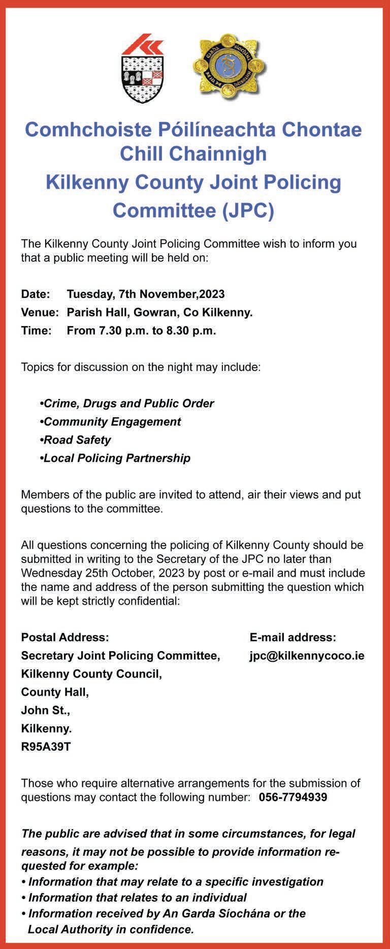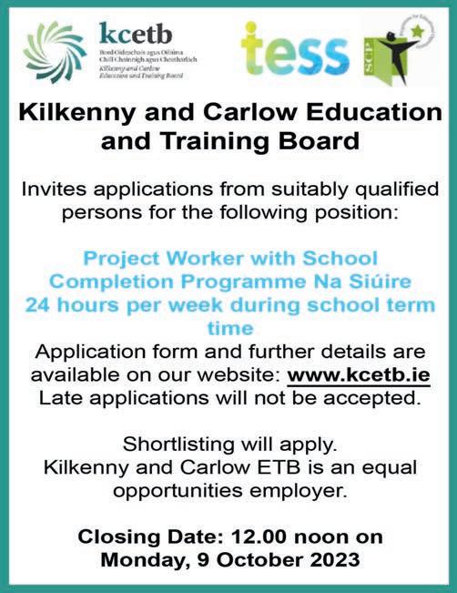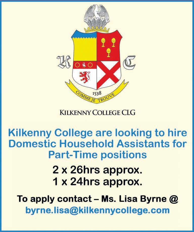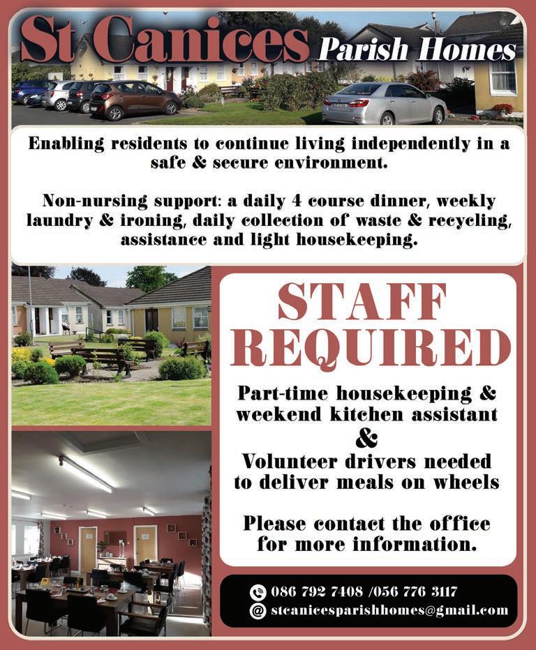 St Kieran’s Homes for the Elderly: Applications are invited for the Vacant Tenancy of a one-bedroom house at St Kieran’s Place, Urlingford. To be eligible to apply you must be on the Kilkenny County Council Housing list. Applications are available from the centre.