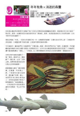 你知道台灣固有的香魚早已絕跡了嗎?目前在河裡釣的或是餐廳吃的香魚,都是晚近自日本引進的「 陸封型」香魚,台灣原有具河海洄游特性的「降海型」香魚,因過度濫捕及河川污染等因素,已在 1960年代消失滅絕了! 香魚又稱為「年魚」,因其生命週期只有一年。台灣香魚的家鄉,主要在淡水河系上游,三峽溪亦常 見其游蹤,三峽舊拱橋下的卵石灘,正是當年香魚的產卵地點。 今年梅樹月,藝術家們在三峽溪畔的「甘樂文創」展區,將用他們的作品「復育」台灣香魚。而前輩 藝術家李梅樹1938年油畫《香魚》也將重見天日,此件作品大概是碩果僅存的時代見證了!李梅樹在 畫中還清楚點繪出「香魚」、「月桃葉」此二尋常物種與在地常民生活的密切關係,意義更加非凡。 自然生態作家劉克襄除了一 幅「香魚」素描作品,還貢 獻了一篇文章,以其「文學 之筆」詮釋他對香魚與自然 生態人文的跨域觀察。 熱愛懷舊元素的「豪記歌舞 團」許晏豪,利用陶土「 烤」了兩尾特大號Q版香 魚,還刻畫了拱橋、鳶山、 老厝等在地元素在香魚身 上,並特別為梅樹月塑造了 熱鬧繽紛的「海底總動員」 ,共有多達百件造型各異其 趣的手捏陶魚,令人目不暇 給。
