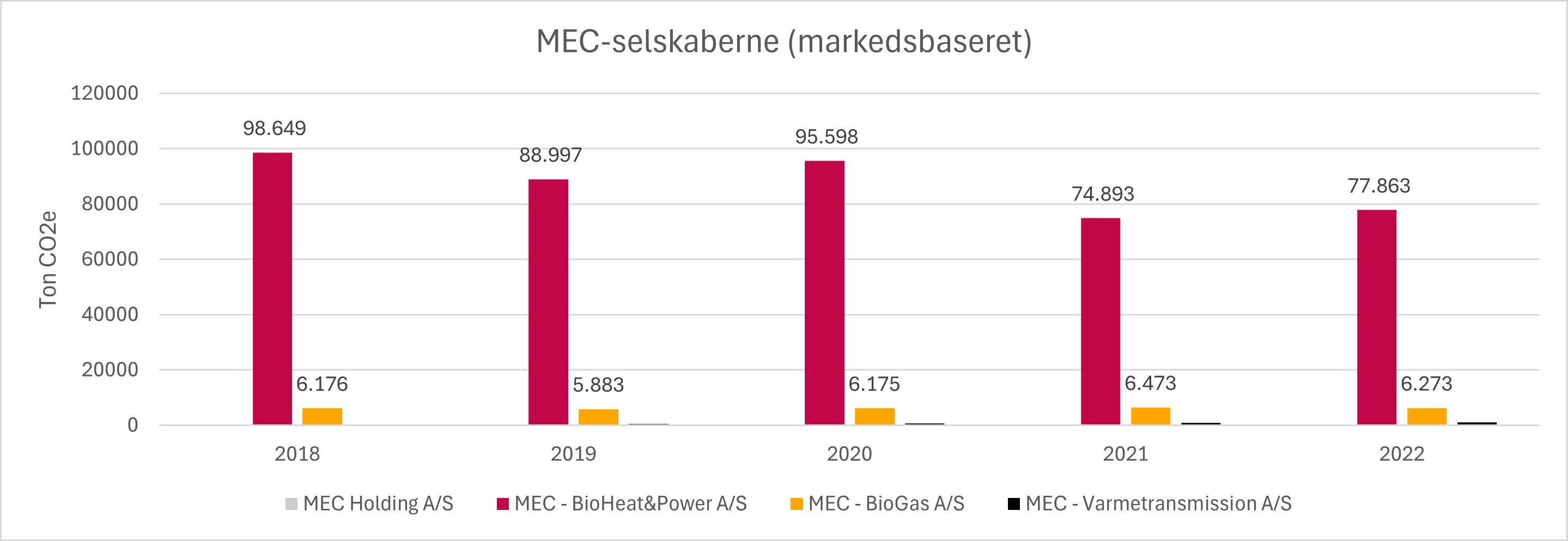 Opgørelse af CO2e-udledningen fra MEC-selskaberne i perioden 2018-2022 viser, at udledningen fra MEC - BHP A/S har udgjort ca. 93%, udledningen fra MEC - BioGas A/S ca. 6,5% og fra MEC - Varmetransmission A/S mindre end 1%. Det fremgår også, at udledningen fra MEC - BHP A/S er faldet markant fra 95.598 i 2020 til 74.893 i 2021 og 77.863 i 2022, jf. som nævnt et fald i affaldsmængderne.