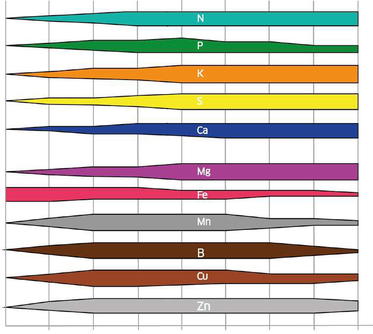 I nedenstående figur ses, at jordens pH-tal er afgørende for den optimale optagelse i planterne af de forskellige næringsstoffer. Rt er defineret som jordens pH + 0,5.
