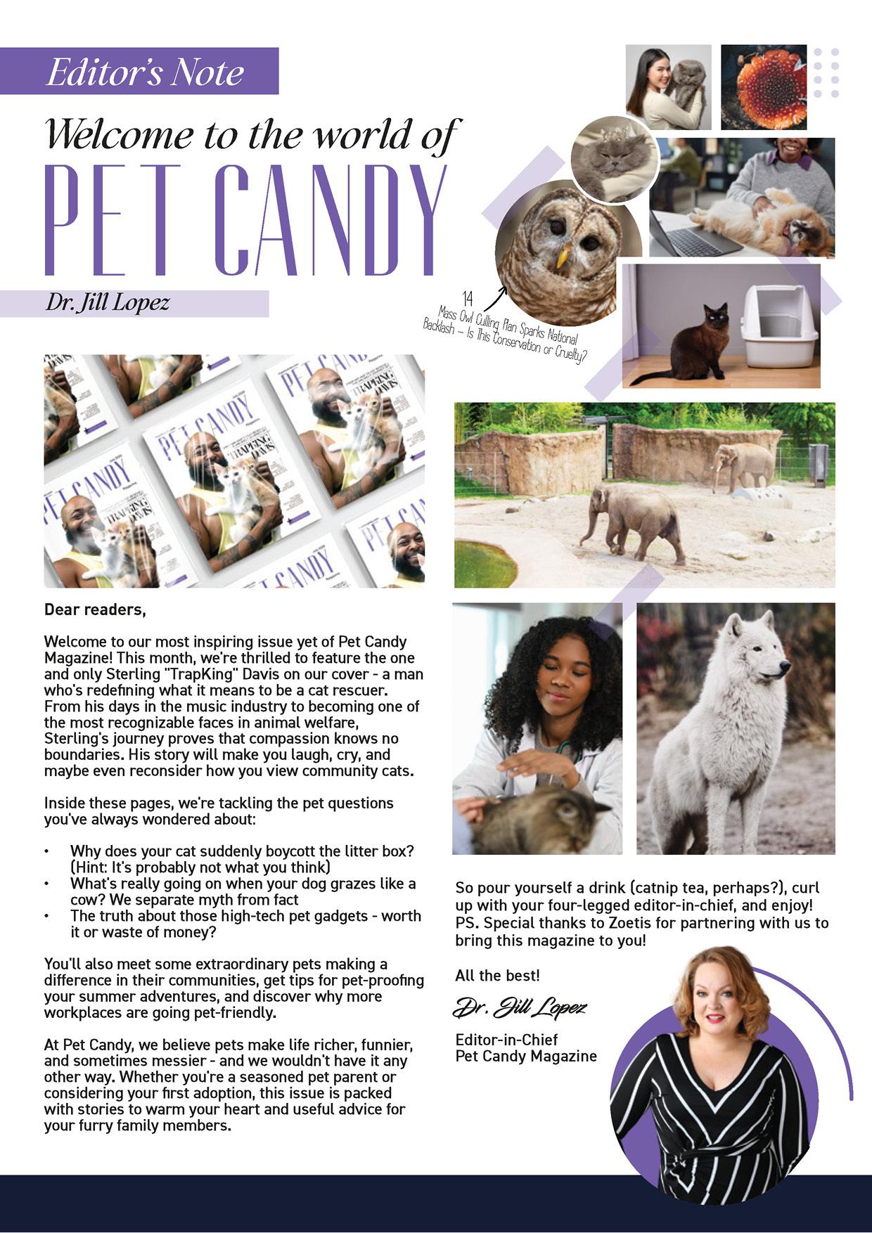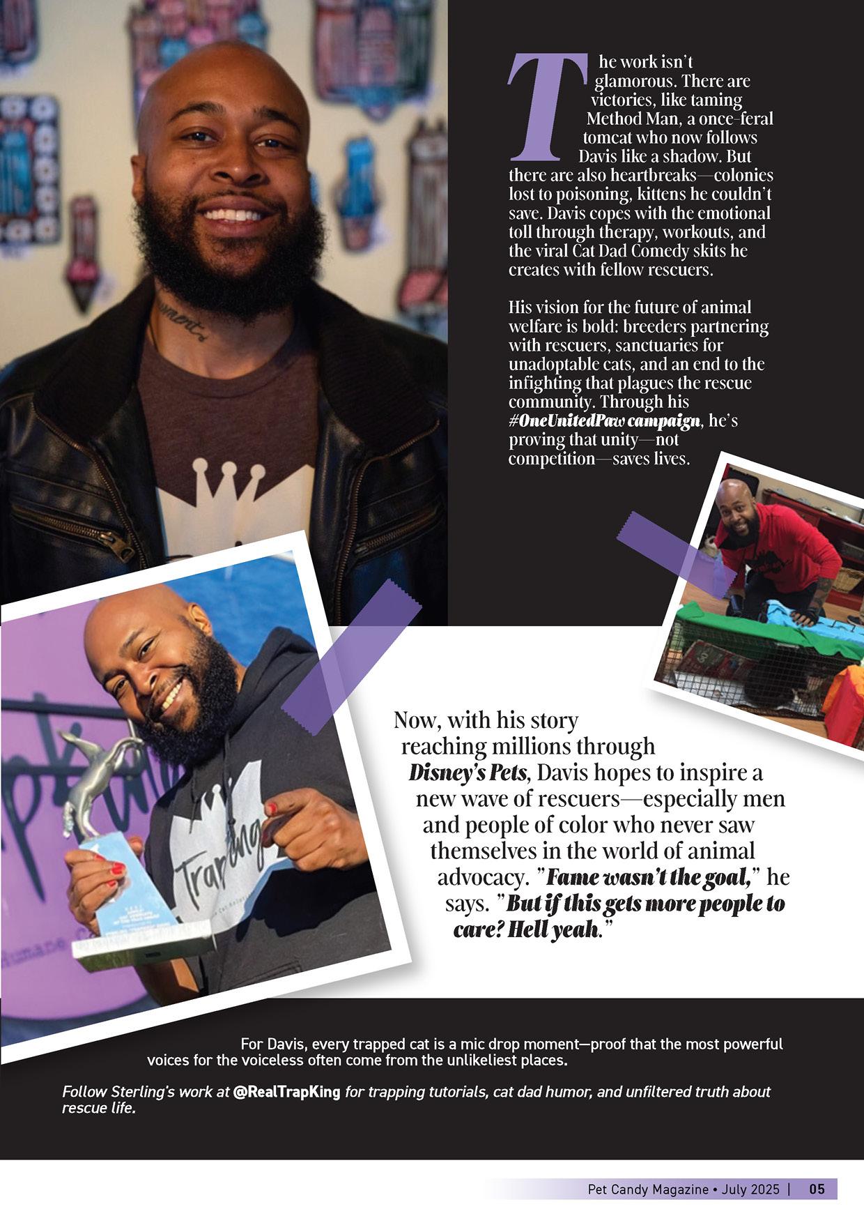 Welcome to our most inspiring issue yet of Pet Candy Magazine! This month, we're thrilled to feature the one and only Sterling Davis "TrapKing" on our cover - a man who's redefining what it means to be a cat rescuer. From his days in the music industry to becoming one of the most recognizable faces in animal welfare, Sterling's journey proves that compassion knows no boundaries. His story will make you laugh, cry, and maybe even reconsider how you view community cats.