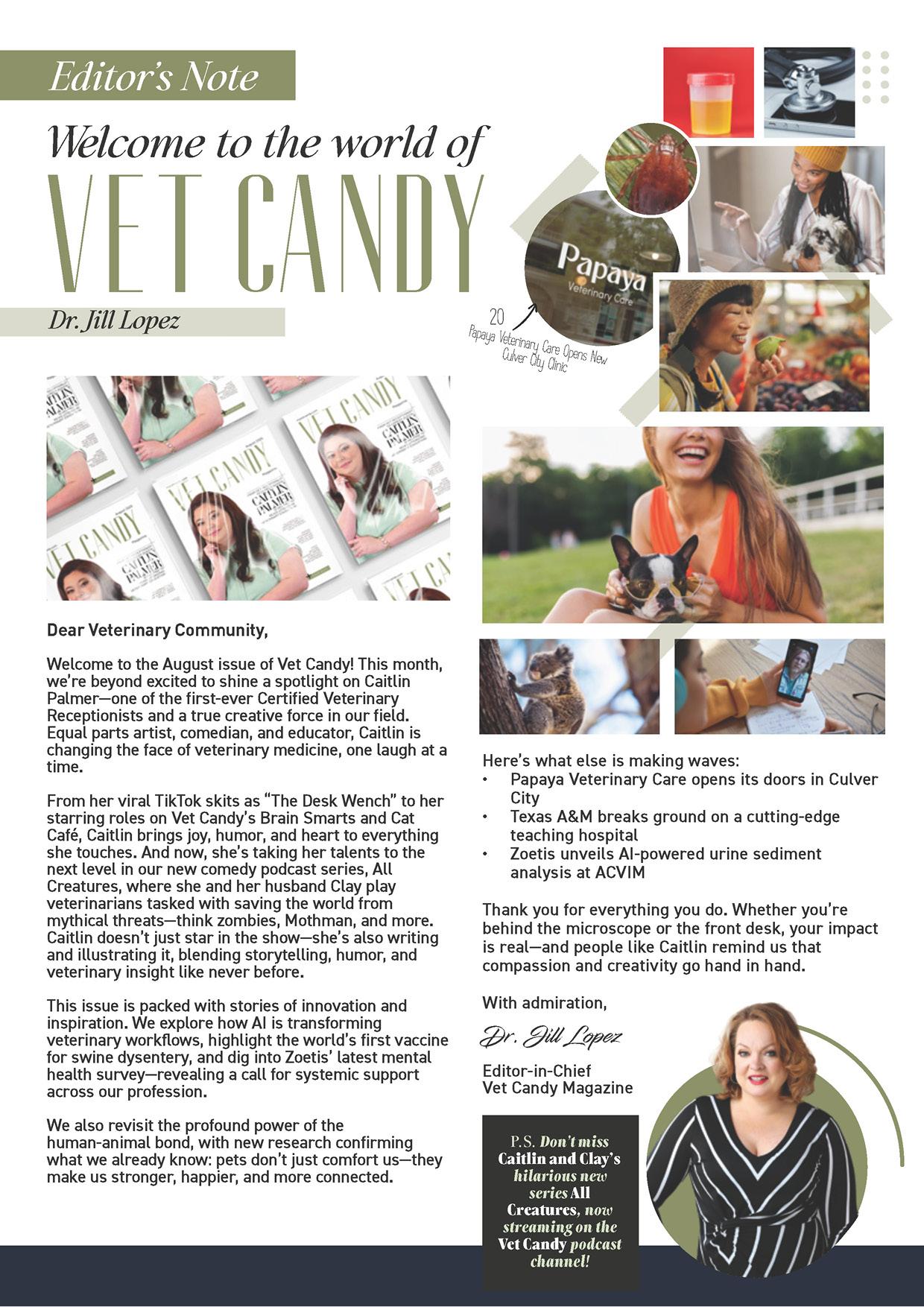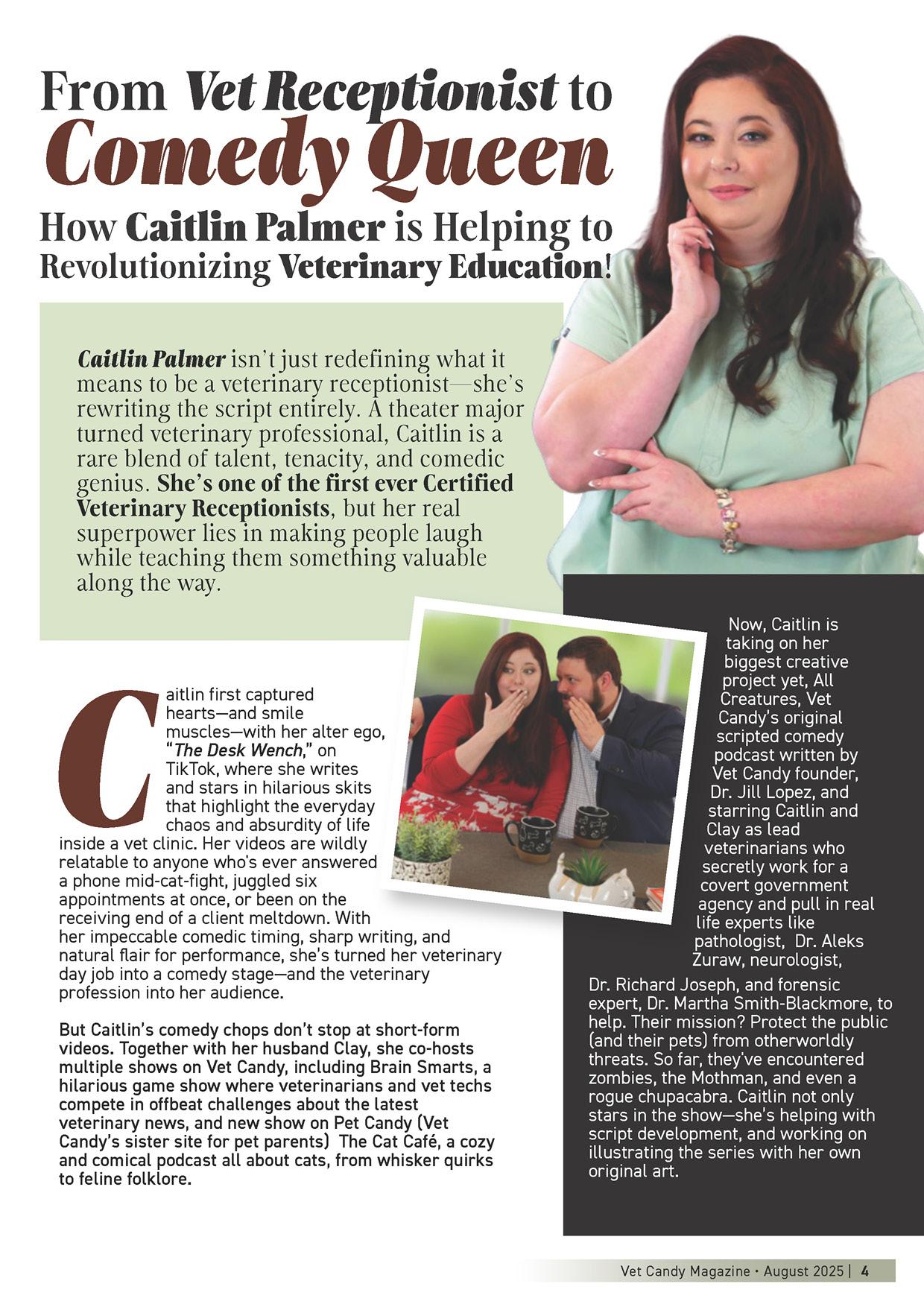 Welcome to the August issue of Vet Candy! This month, we’re beyond excited to shine a spotlight on Caitlin Palmer—one of the first-ever Certified Veterinary Receptionists and a true creative force in our field. Equal parts artist, comedian, and educator, Caitlin is changing the face of veterinary medicine, one laugh at a time.
