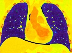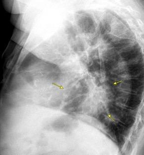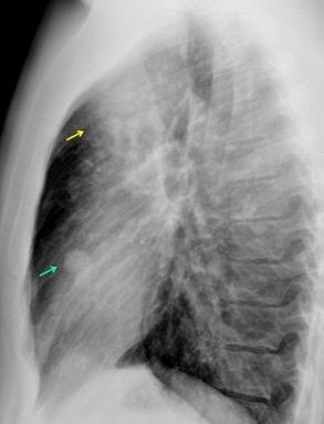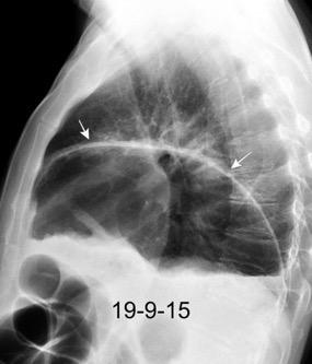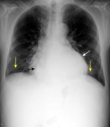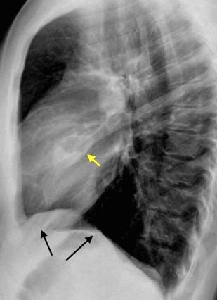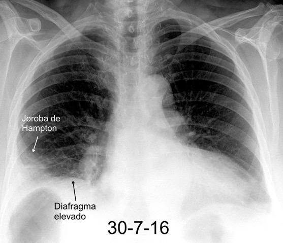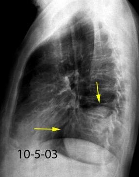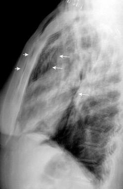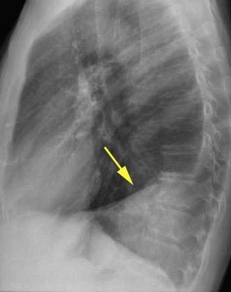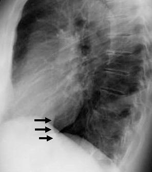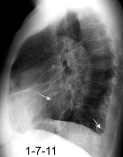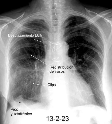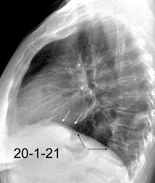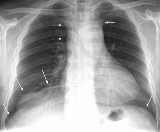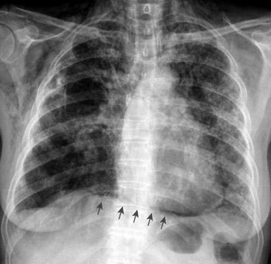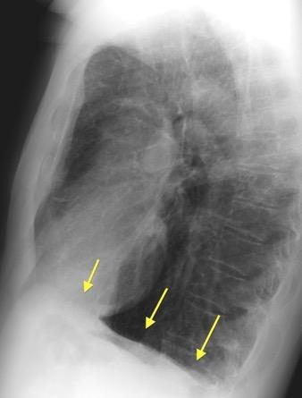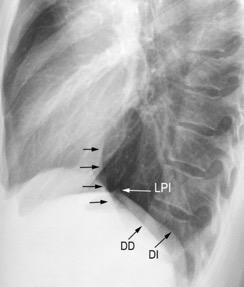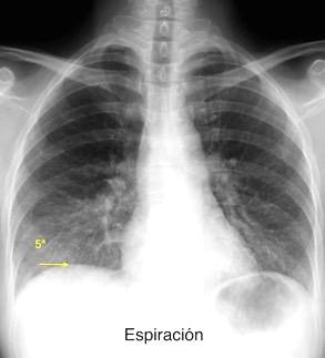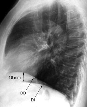 La ocupación del espacio pleural por derrame (o obstrucción aérea) se acomoda con expansión aumentada de la caja torácica, especialmente en eje vertical. La consecuencia es aplanamiento e incluso inversión diafragmática.
