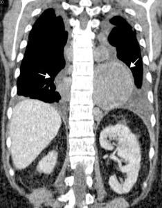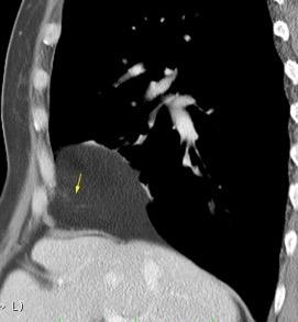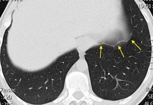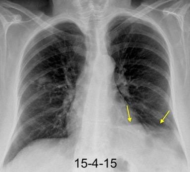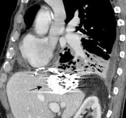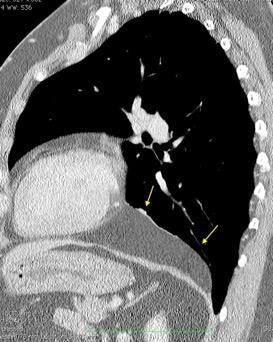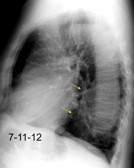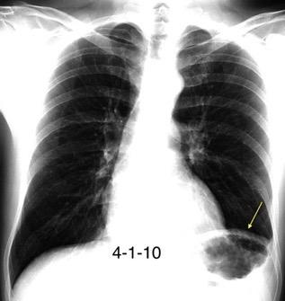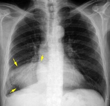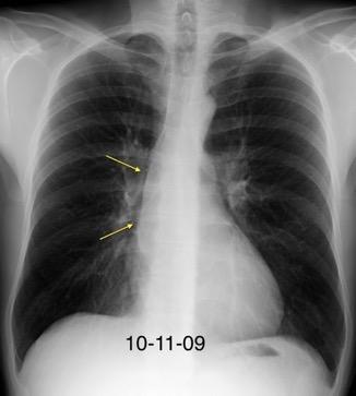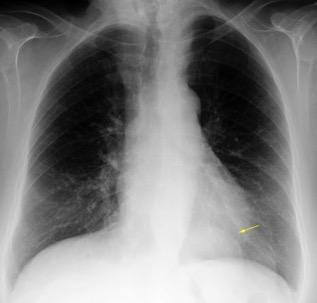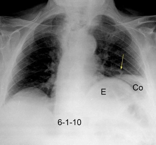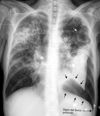 El aire en la cavidad pleural, neumotórax, queda en ocasiones atrapado en la base pulmonar, siendo difícil el diagnóstico diferencial con neumomediastino.