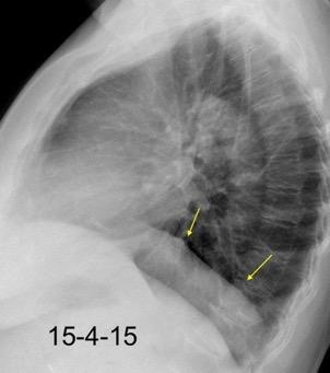 Hemidiafragma izquierdo Atelectasia de la pirámide basal izquierda borrando la parte medial y posterior.