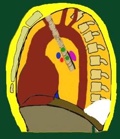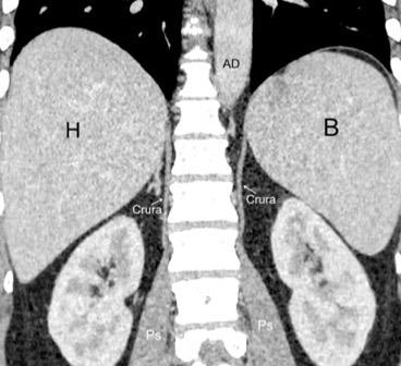 Las fibras más bajas de las cruras se funden con las de las vainas de los músculos psoas, acotando un espacio llamado “Espacio abierto de la vaina del psoas”, que comunica las cavidades torácica y abdominal.