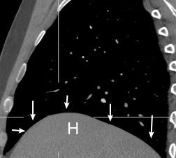 Diafragma izquierdo +/-16mm El ligamento pulmonar izquierdo (LPI) puede interrumpir la interfase normal pulmonar-diafragma obliterando un pequeño segmento