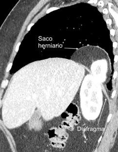 del hiato esofágico que permite la subida al tórax de estómago y omento.