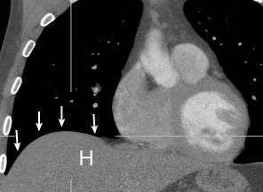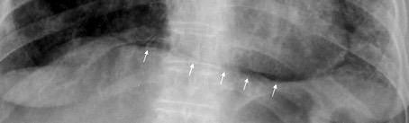 Visualización del diafragma, incluso en la parte central, debido al neumomediastino