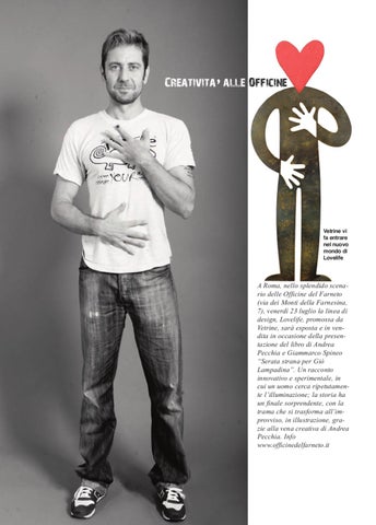 A Roma, nello splendido scenario delle Officine del Farneto (via dei Monti della Farnesina, 7), venerdì 23 luglio la linea di design, Lovelife, promossa da Vetrine, sarà esposta e in vendita in occasione della presentazione del libro di Andrea Pecchia e Giammarco Spineo “Serata strana per Giò Lampadina”. Un racconto innovativo e sperimentale, in cui un uomo cerca ripetutamente l’illuminazione; la storia ha un finale sorprendente, con la trama che si trasforma all’improvviso, in illustrazione, grazie alla vena creativa di Andrea Pecchia. Info www.officinedelfarneto.it