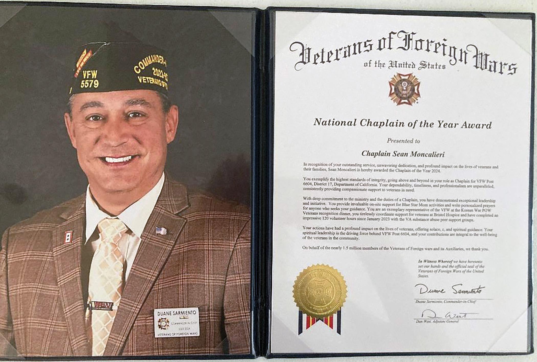 Congratulations to Chaplain Sean Moncalieri of Post 6604, District 17 for being named the VFW National Chaplain of the Year! Chaplain Sean has shown tremendous dedication and leadership and was named the Chaplain of the Year for the Department of California. With this honor, he was submitted to National for consideration by a committee of Department Chaplains. He was then selected as the VFW National Chaplain of the year. This is the highest award in the VFW for chaplains! The nomination was written and submitted by Folsom VFW Post 6604 Commander Robert Lee.