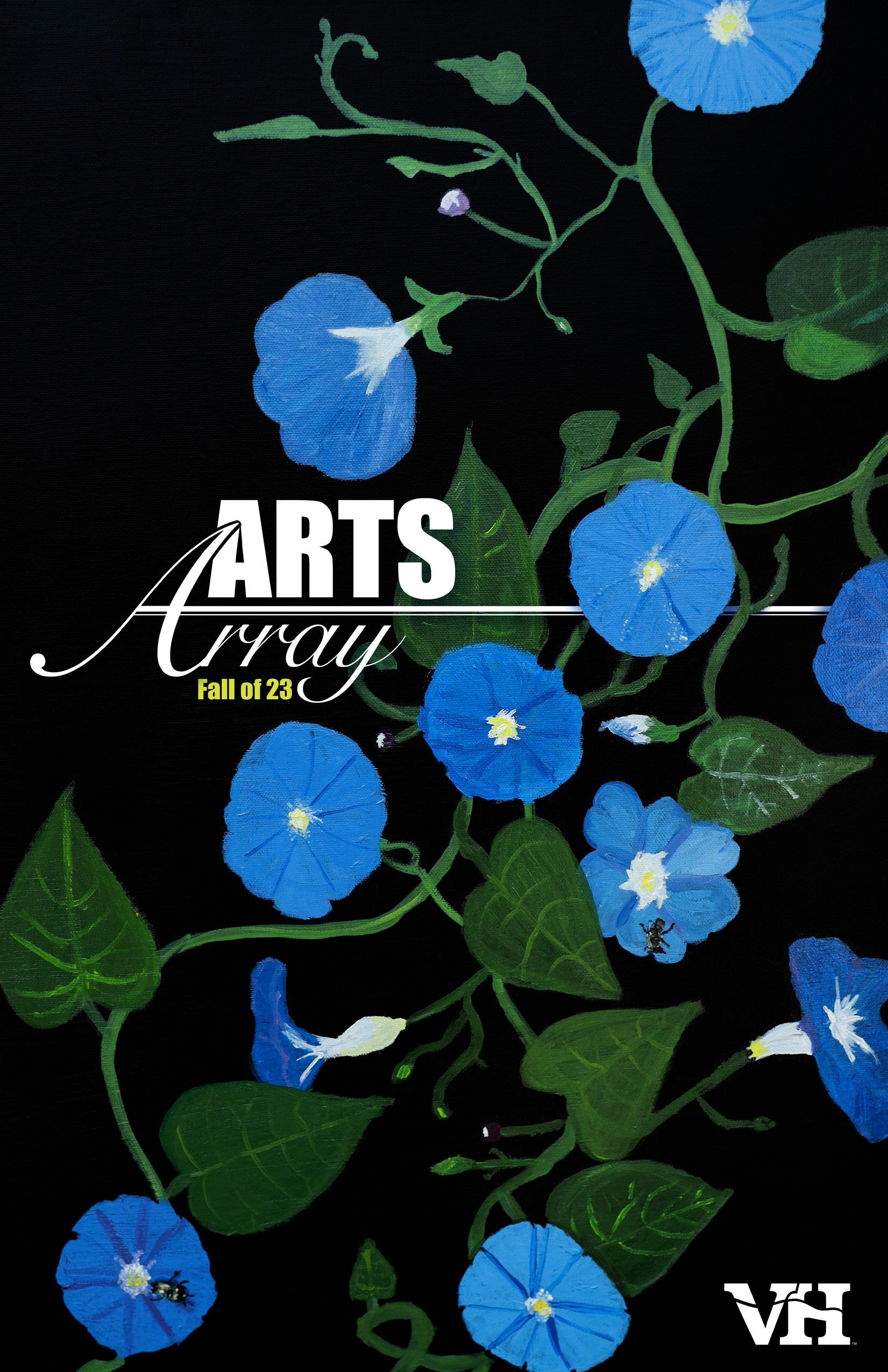 The winner of the competition for Arts Array cover design is Rebecca Pippin with her blue morning glory flowers painting.