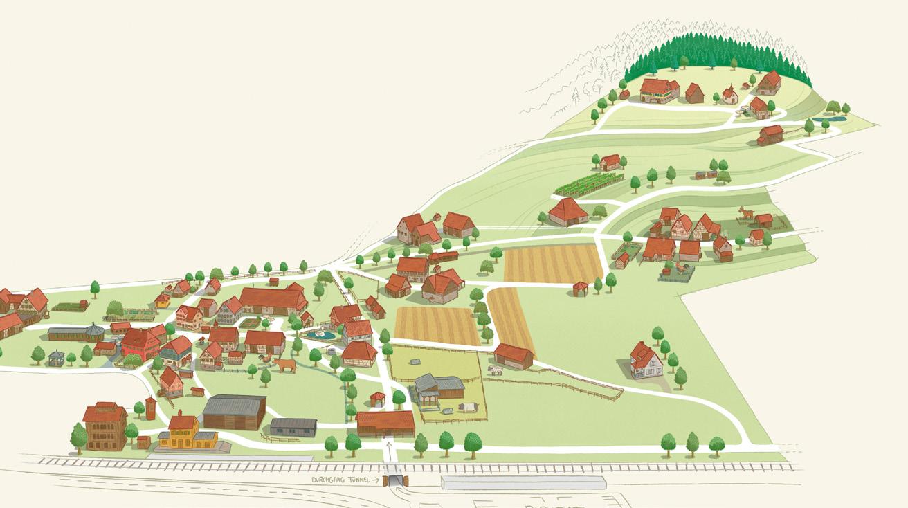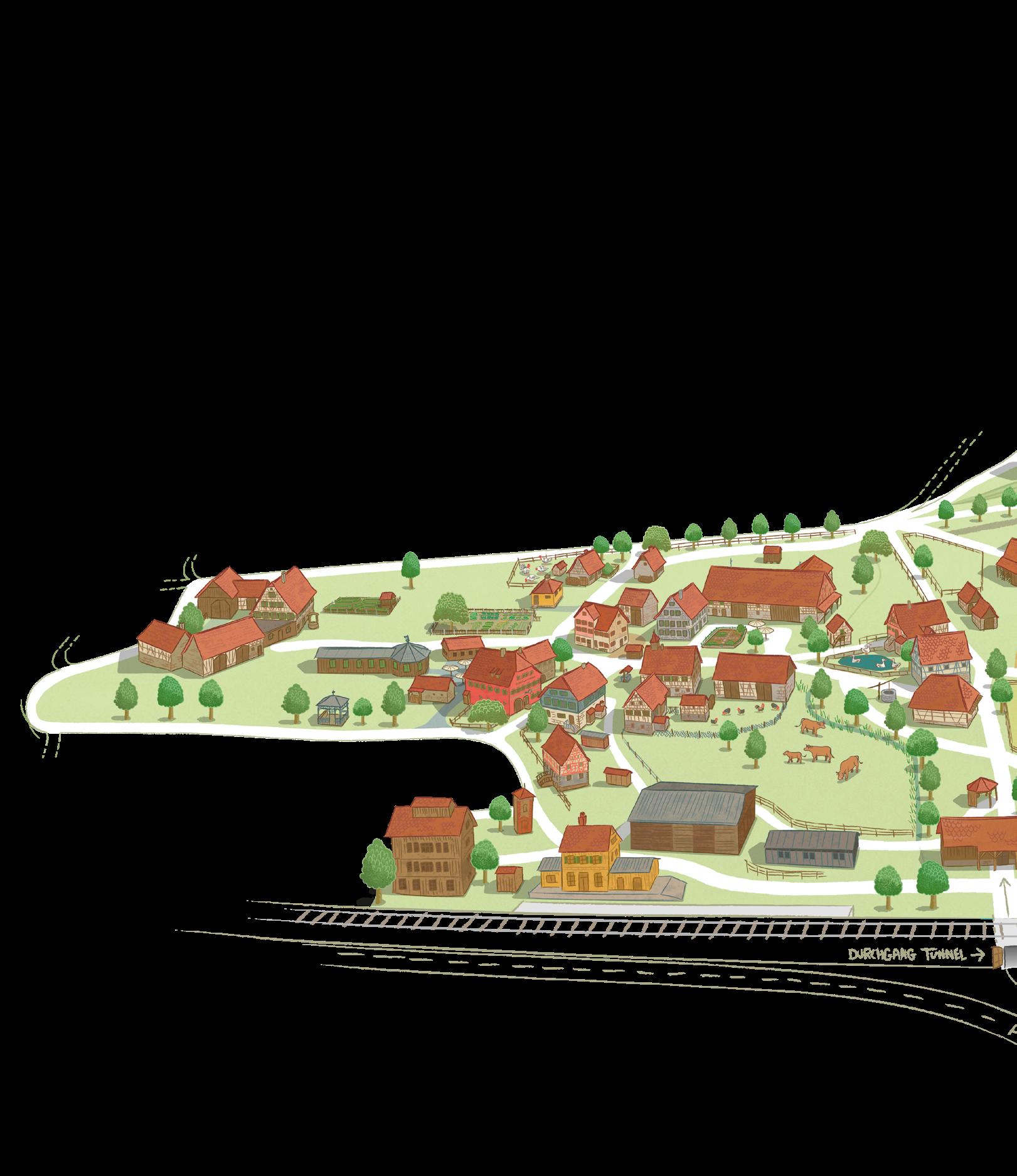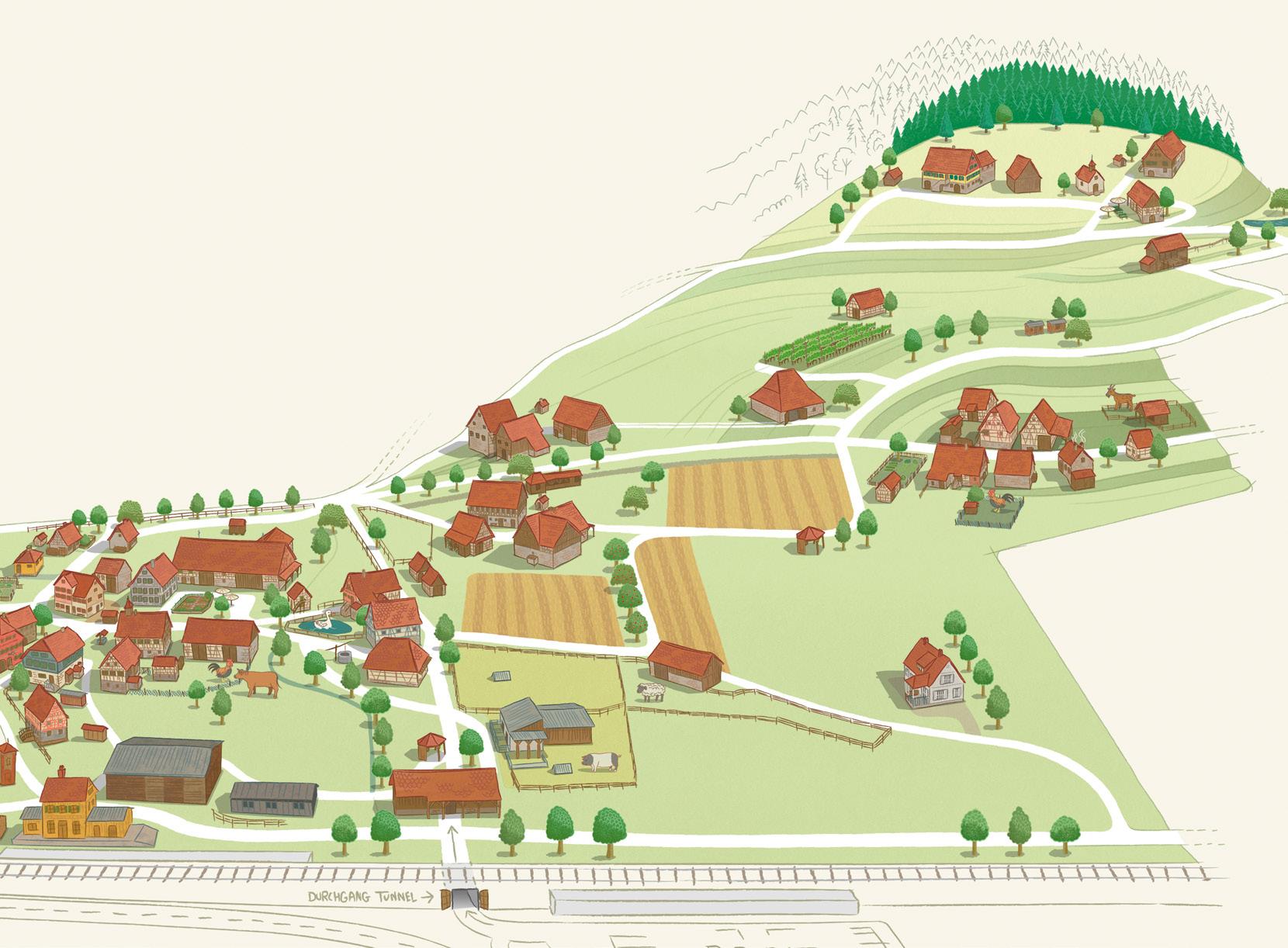 Vom stattlichen Bauernhof bis zum Taglöhnerhäuschen, von der Mühle bis zum Bahnhof, vom Schulhaus bis zum Gefängnis reicht die Palette der rund siebzig historischen Gebäude aus der Zeit vom 16. bis zum 20. Jahrhundert. Umgeben von Gärten und Feldern, belebt von Bauernhoftieren wird hier die Vergangenheit lebendig.