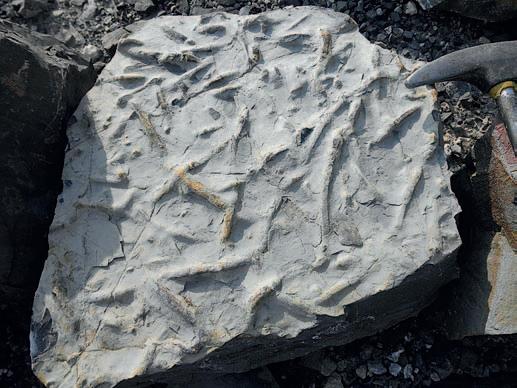 Ukázky běžných jurských zkamenělin na Hádech. Ramenonožci (brachiopodi), vpravo dole úlomek belemnita.