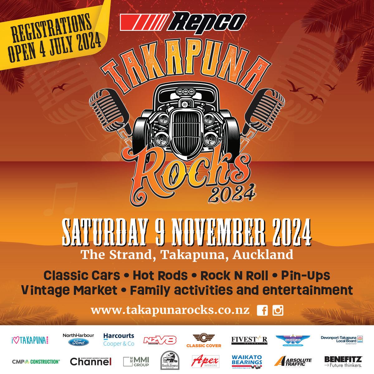Takapuna Rocks is seeking registrations for cars and bikes from 4 July. For more information see takapunarocks.co.nz.