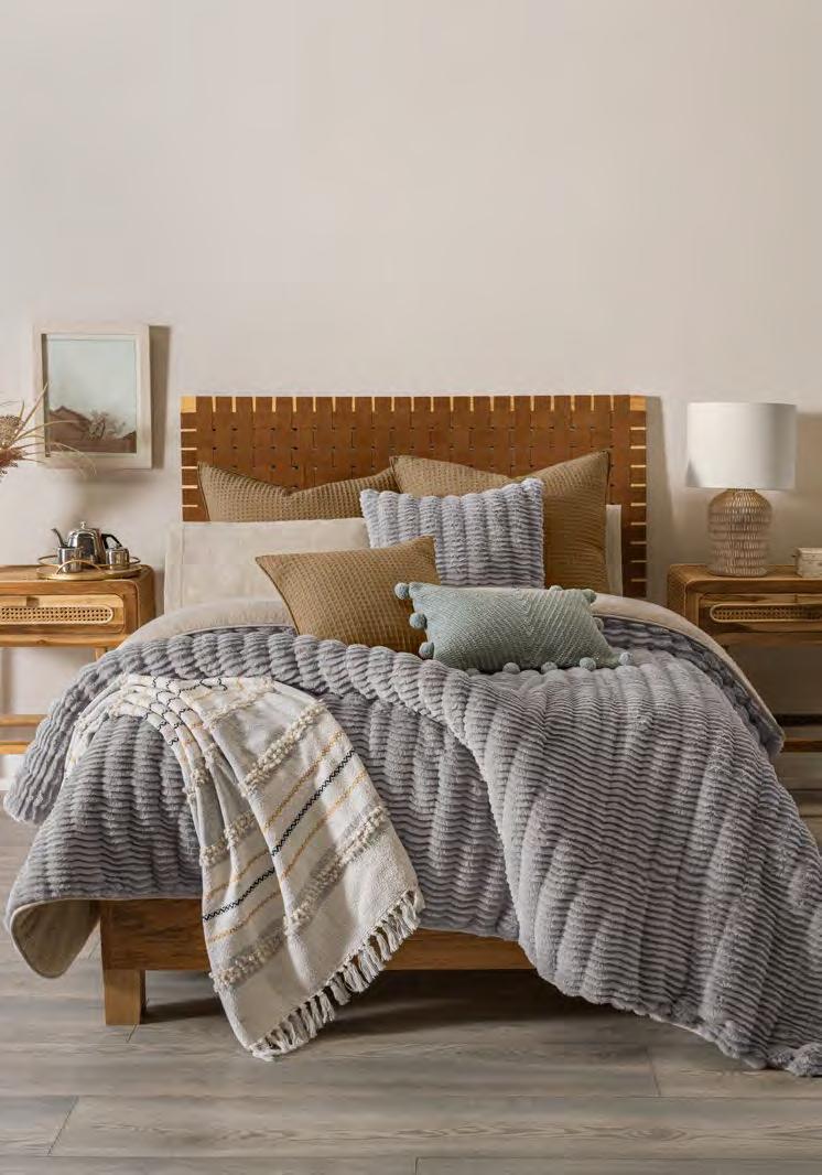 habitación acogedora. Añade complementos textura en relieve súper suave MEDIDA XL CALIDEZ BORREGA PREMIUM TENDENCIA. c. b. a. d. Llévala contigo en los días fríos y disfruta de su suave textura. talla frazada Antar Cobertor Everest COP GTQ CRC *Complementos se venden por separado 88193 $207,900 109 x 170 cm FRAZADA Q329 ₡23,500 88194 $489,900 215 x 230 cm MAT XL Q899 ₡64,500 88195 $498,900 225 x 230 cm QS XL Q899 ₡67,900 88196 $631,900 275 x 230 cm KS XL Q1,179 ₡83,900 a. Funda De Almohada Europea Voga Incienso - 87657 - $108,500 / Q175 / ₡12,500 b. Cojín Cuadrado Everest Antar - 88221 - $104,500 / Q189 / ₡13,900 c. Funda De Cojín Rect Mumbai Gris - 87801 - $132,900 / Q219 / ₡15,500 d. Mumbai Beige Frazada - 77556 - $153,900 / Q239 / ₡17,500 Funda De Almohada Europea Voga Turquesa 87656 Pag. 102-103 06 07