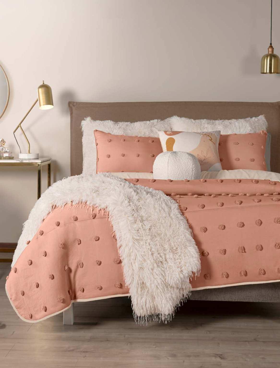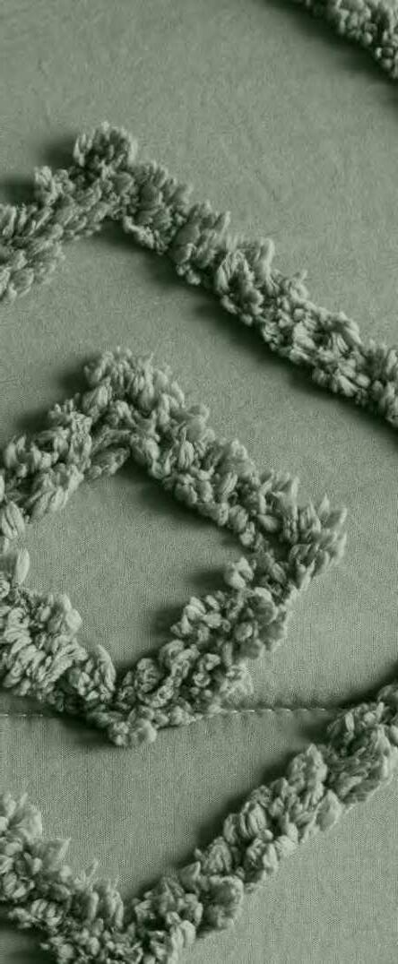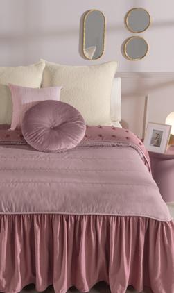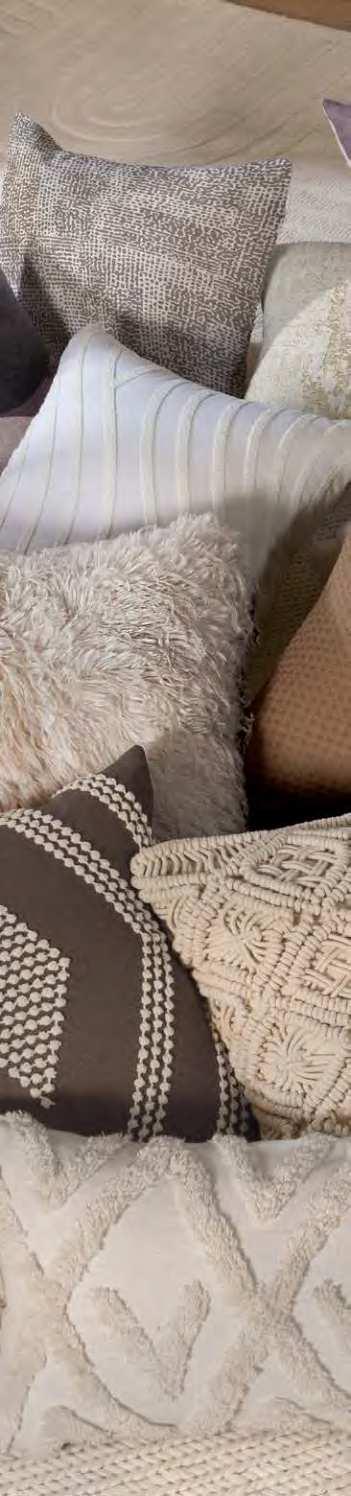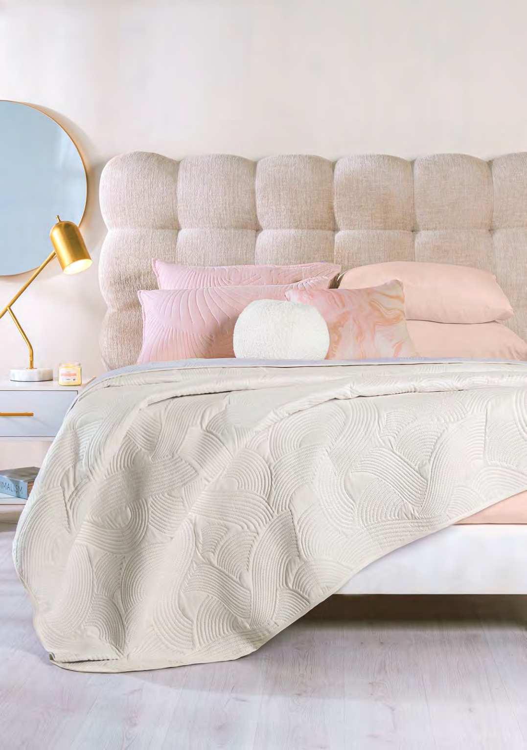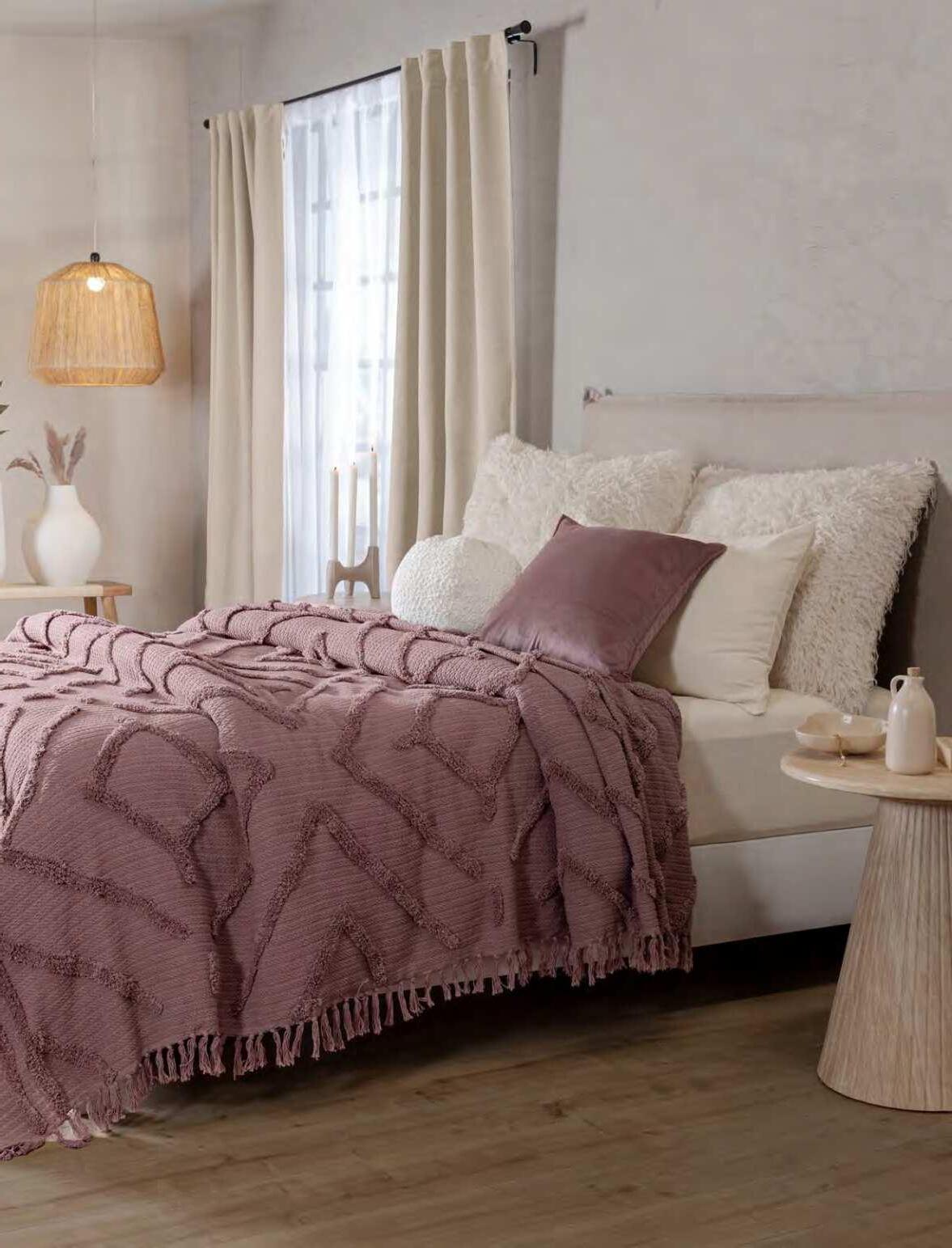 Winning blend oftextures,enjoythe waf昀氀etextureonthebedcoverand cushion,the bouclétextureonthe pillowcases andthe velvettexture ontherectangularcushion