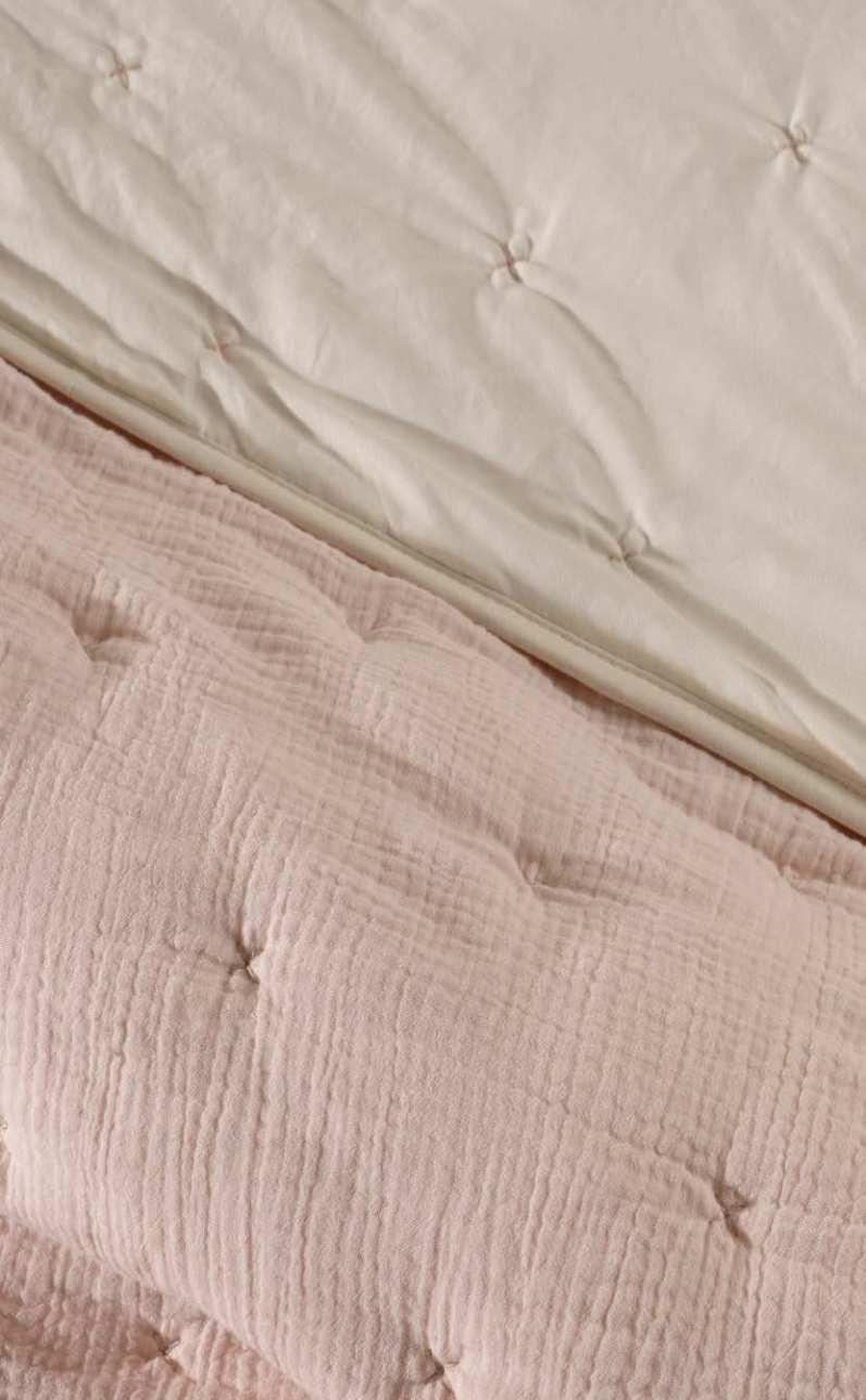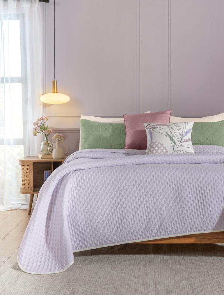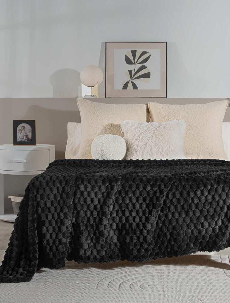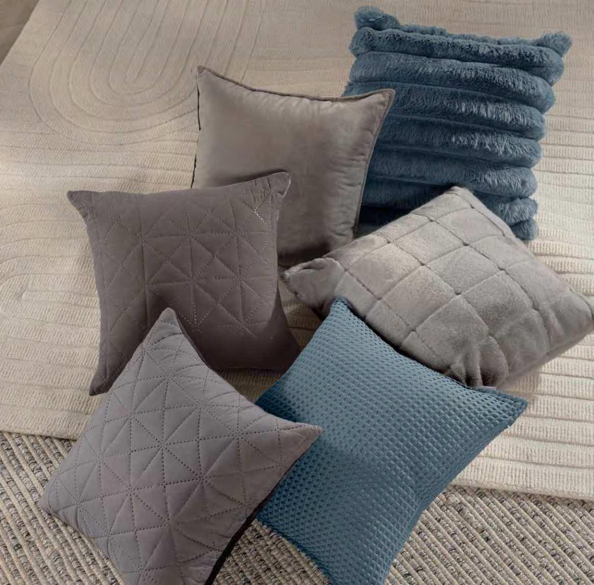 Winning blend oftextures,enjoythe waf昀氀etextureonthebedcoverand cushion,the bouclétextureonthe pillowcases andthe velvettexture ontherectangularcushion