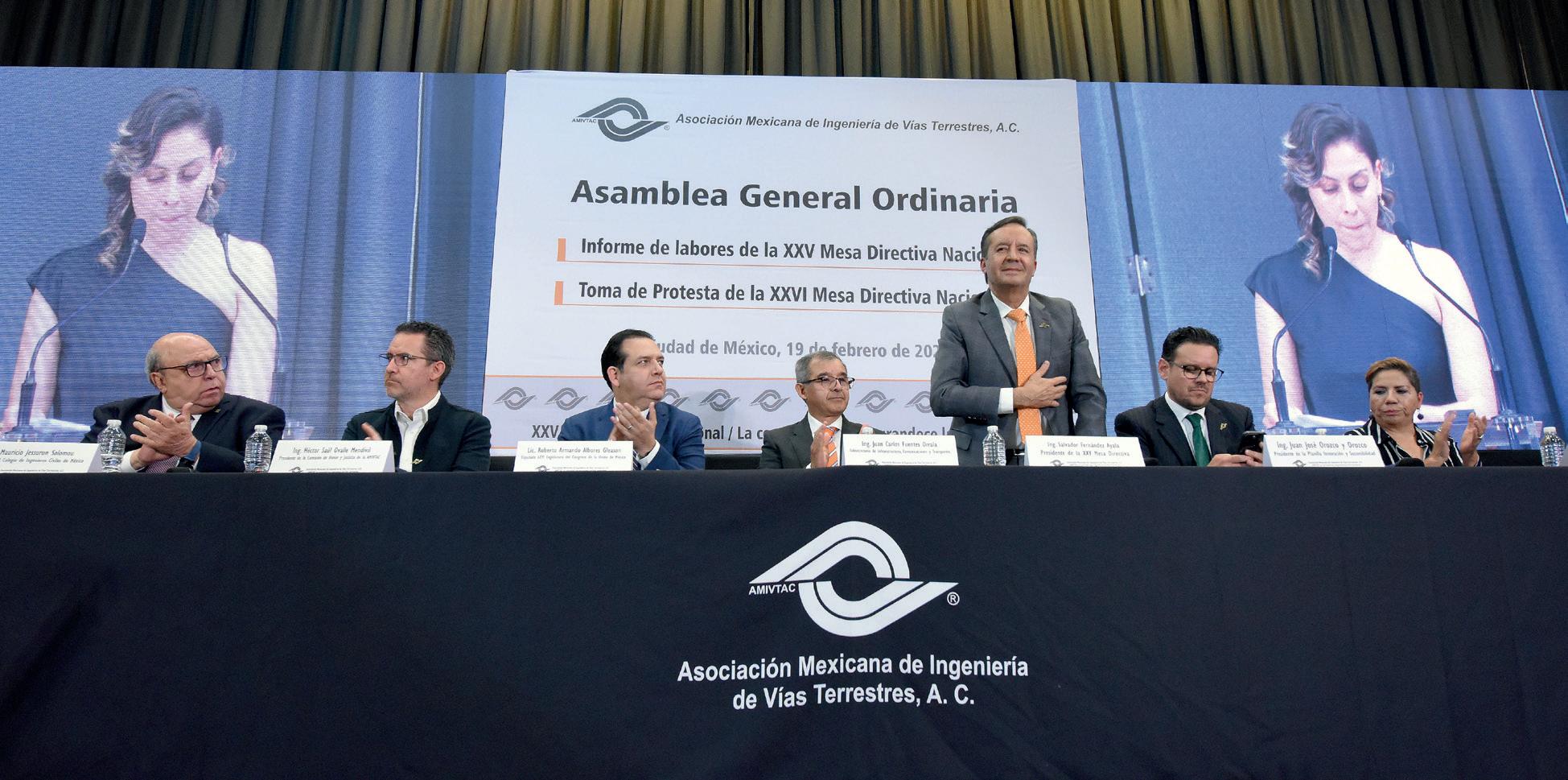 Después de un breve receso se reanudó con el segundo punto de la Asamblea General Ordinaria: Toma de protesta de la XXVI Mesa Directiva. El presídium estuvo conformado por el Ing. Juan Carlos Fuentes Orrala, subsecretario de Infraestructura de la SICT; el Lic. Roberto Albores Gleason, presidente de la Comisión de Infraestructura en la LXVI Legislatura del Congreso de la Unión; el Ing. Salvador Fernández Ayala, presidente de la XXV Mesa Directiva Nacional; el Ing. Héctor Saúl Ovalle Mendívil, en representación del presidente de la Comisión de Honor y Justicia de la AMIVTAC; el Ing. Juan José Orozco y Orozco, presidente de la planilla Innovación y sostenibilidad; el Ing. Mauricio Jessurun Solomou, presidente del Colegio de Ingenieros Civiles de México; la contadora Dalia Eréndira Mendoza Puga, presidenta de la Delegación AMIVTAC Guanajuato, en representación de las delegaciones estales.