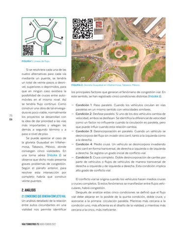 los principales factores que generan el fenómeno de congestión vial. En este sentido, se han registrado cinco condiciones distintas (FIGURA 3). — Condición 1: Paso paralelo. Cuando los vehículos circulan en vías paralelas en un mismo sentido con velocidades similares. — Condición 2: Desfase paralelo. Si uno de los dos vehículos cambia de velocidad, ambos se desfasan. Se identifica la diferencial de velocidad como un factor no influyente cuando la circulación es paralela, pero que puede influir cuando esta relación cambia. — Condición 3: Desincorporación en paralelo. Cuando un vehículo se desincorpora del flujo sin invadir otro carril, tanto a la izquierda como a la derecha. — Condición 4: Medio cruce. Un vehículo se desincorpora invadiendo otro carril en forma transversal, de derecha a izquierda o de izquierda a derecha. Se registra un grado inicial de conflicto vial. — Condición 5: Cruce completo. Doble desincorporación de carriles por parte de vehículos o flujos de vehículos de manera transversal de derecha a izquierda y de izquierda a derecha. Esta condición implica alto grado de conflicto vial. El conflicto vial se origina cuando los vehículos hacen medios cruces y cruces completos. Si estos fenómenos se manifiestan entre flujos vehiculares, habrá congestión. Después de analizar estas cinco condiciones se definió que el flujo vial debe alejarse en lo posible de la quinta condición, doble cruce, y acercarse a la primera: circulación paralela. Mientras más cercana a la condición uno, más eficiente es el diseño de la vialidad, y mientras más cercana a la cinco, más ineficiente.