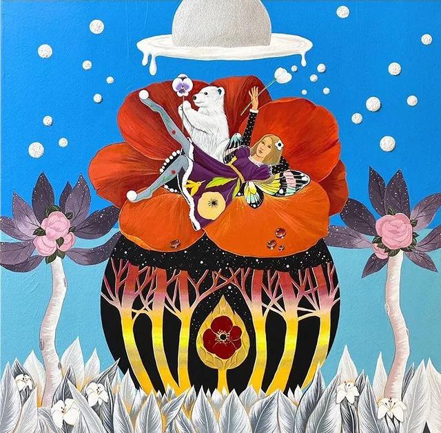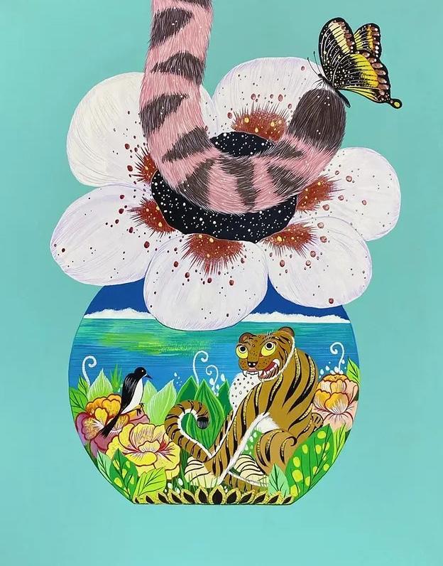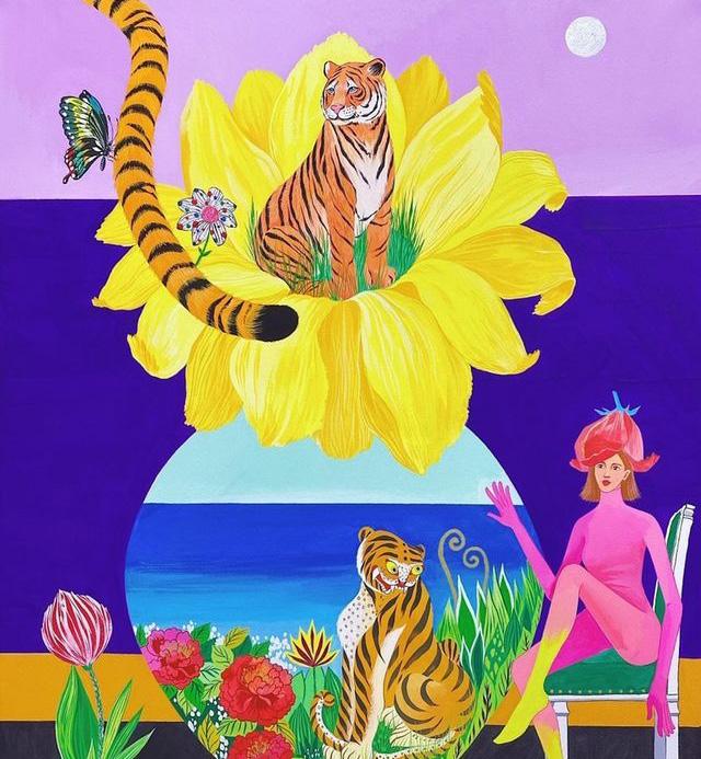 Hee-Jeong is also influenced by therapeutic moments spent with childhood pets and encounters with rare creatures boasting the most flamboyant aesthetics. From white peacocks adorned with cotton candy hearts, to purpletinted leopards emerging from colossal floral buds, her artistic menagerie celebrates a harmonious coexistence of animals and human forms. Fulfilling her calling, Hee-Jeong convinces us to open our imaginations and permit the fantastical to flower in everyday life.
