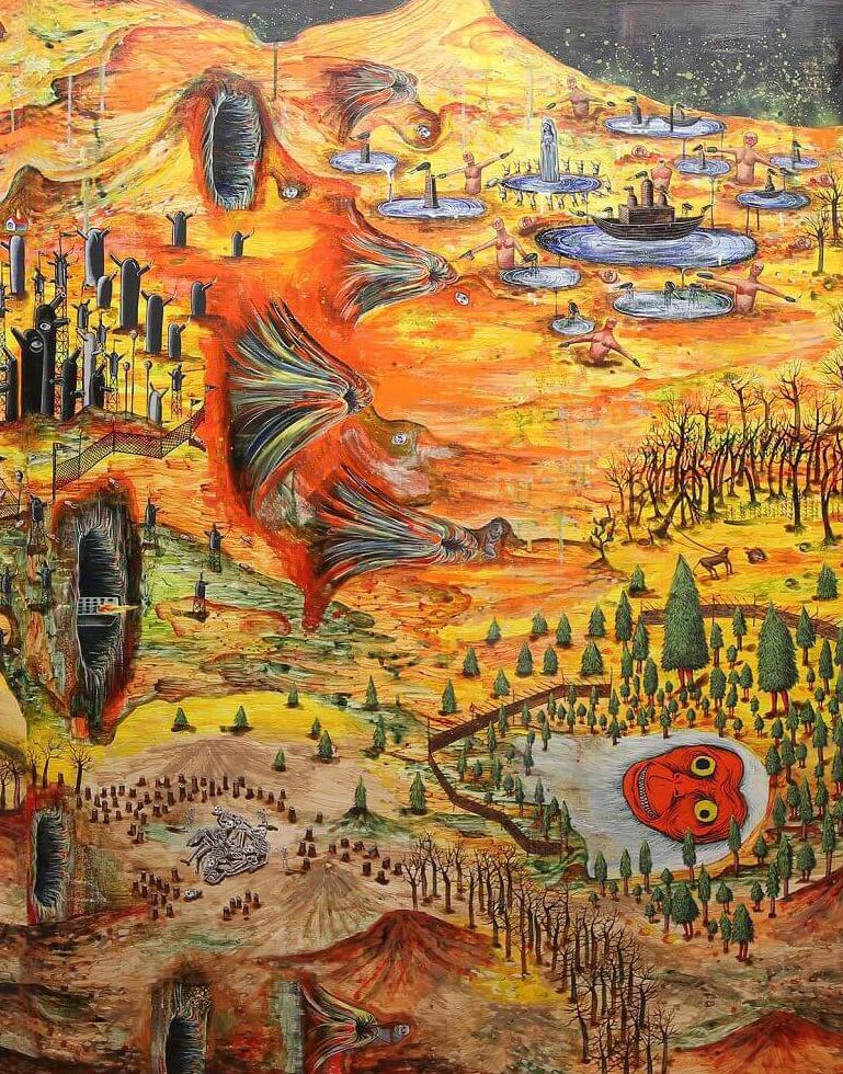 WITH THE PRECISION OF A LANDSCAPE GARDENER, SHE METICULOUSLY CULTIVATES FRAGMENTS OF DAILY LIFE, RESHUFFLING THEM INTO OPULENT COLOR COMBINATIONS OF ACRYLIC AND WATERCOLOR GOUACHE. LIKE VOICES IN AN ECHO CHAMBER, THESE COLORS RESONATE INTO LAYERS AND BREATHE LIFE INTO HEE-JEONG’S SURREALIST UNIVERSE. APPLYING MODELING PASTE TO THE CANVAS, HEE-JEONG INTRODUCES TEXTURE, SUMMONING THE VIEWER TO ENGAGE WITH HER WORK ON A TACTILE LEVEL. EACH PIECE MORPHS INTO A COLLAGE, AN INTRICATE MOSAIC OF PERSONAL MEMORIES, REALWORLD EVENTS, AND THE UNPREDICTABLE TERRAIN OF SUBCONSCIOUS THOUGHTS.