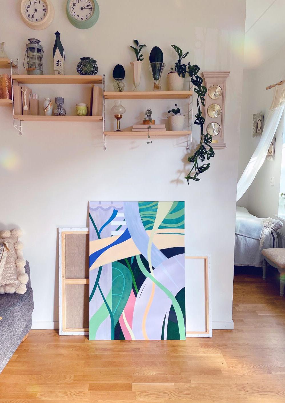 Born and raised in South Korea, SuYeon Seo’s early notions of home were grounded in a fixed, unchanging space. After relocating to Sweden, however, her concept of home began to stretch and shift, much like the abstract forms that grace her canvas. Indeed, her distinctly cultural and personal compositions reconstruct and rearrange existing realities into something new and positively brimming with possibility.
