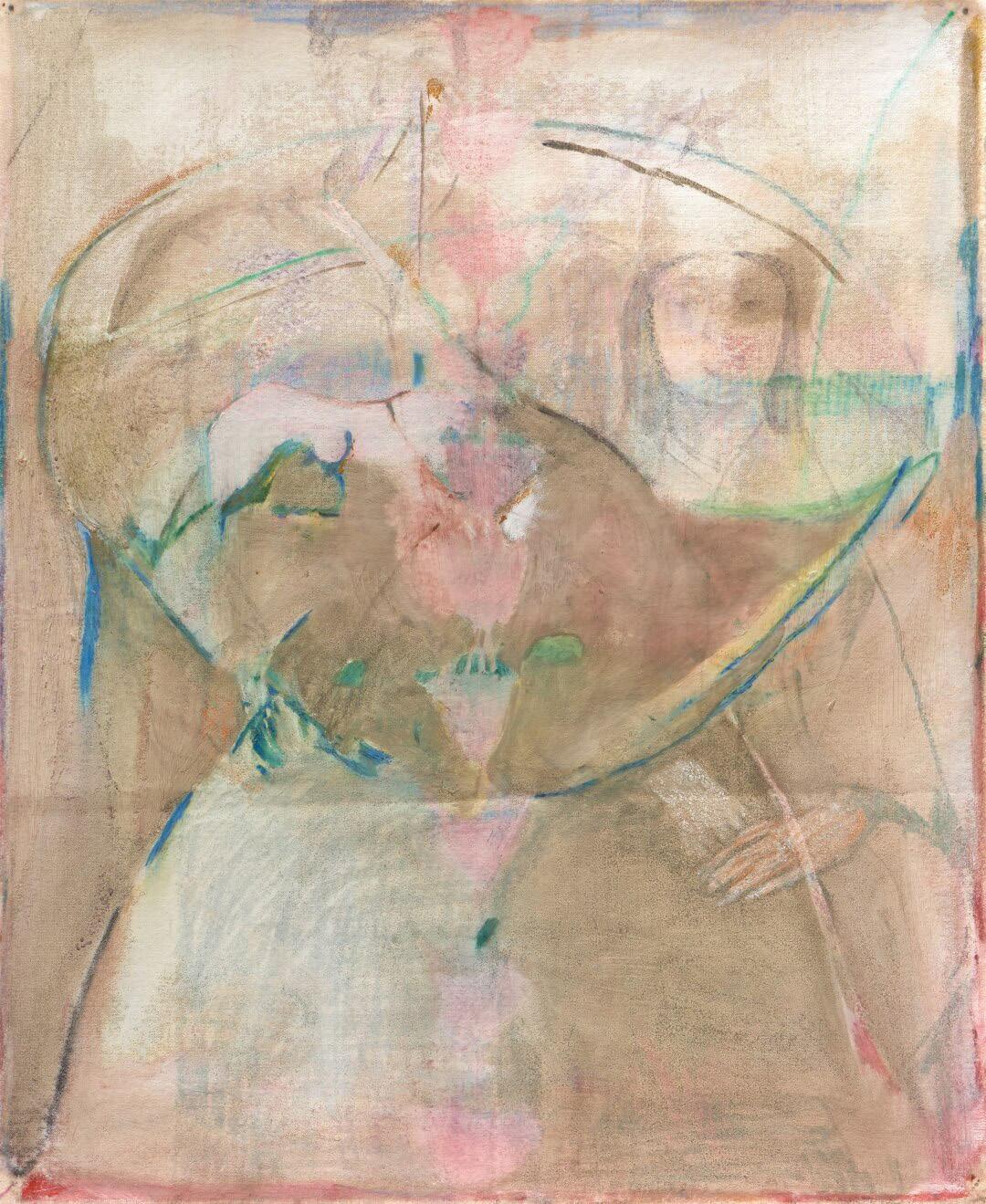 Oil Pastel, Crayon, Acrylic, Colored Pencil, and Oil Ground on Canvas. 67.3 x 55.9cm.