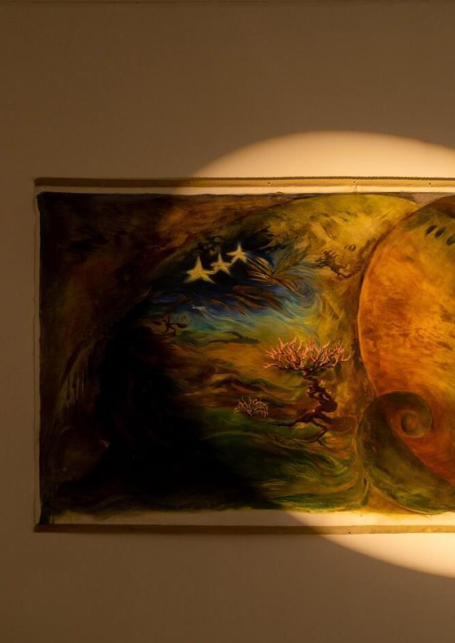 Capricorns (2024) is a painting created with acrylic pours and detailed rendering. Here, instead of presenting a singular, symbolic goat, Seong Yoon portrays a landscape of them, each aligned with the star positions of Capricorn. While each goat ascends its own path, none are truly alone, highlighting the importance of individuality and shared experience. In this way, Seong Yoon interprets home as a presence that moves with us, found in the company of others embarking on their own unique journeys.