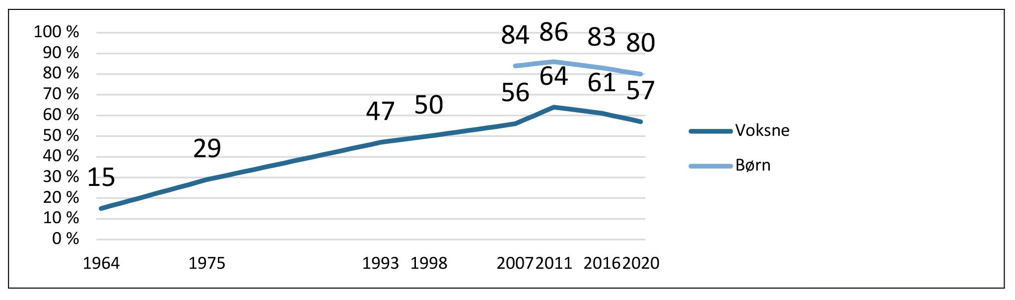 I DK har vi siden 1964 løbende foretaget målinger af danskernes idrætsvaner. Som det fremgår af nedenstående tabel, så er andelen af voksne danskere, der dyrker idræt steget fra 15% i 1964 til 64% i 2011, hvorefter andelen er faldet til 57% i 2020. Tallene fra 2020 skal dog tabes med forbehold, da undersøgelsen er gennemført under indtryk af corona pandemien.