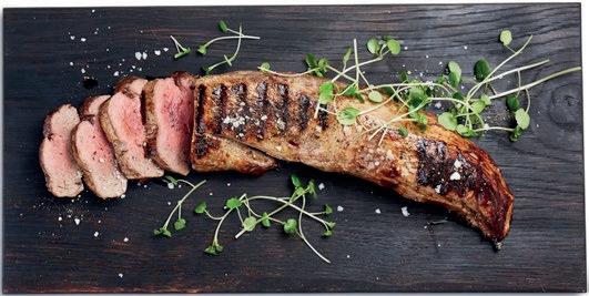1 3 rette: Forret, hovedret af Højgård Hereford oksekød med nye kartofler, sovs, salat og en dessert 215,-