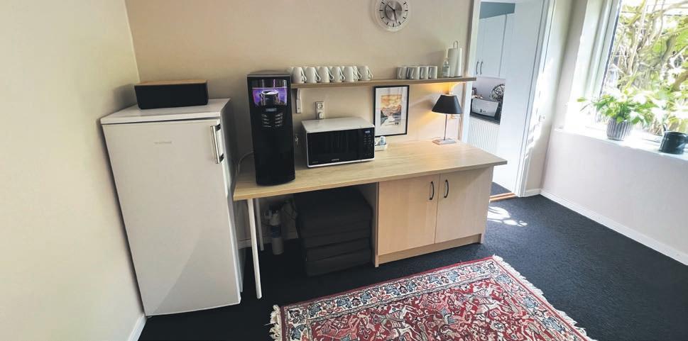 En frokoststue/undervisningslokale med storskærm og max. 20 siddepladser