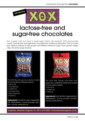 lactose-free and sugar-free chocolates Got a sweet tooth but need to avoid sugar and/or milk products? XOX (pronounced “socks”) lactose-free and sugar-free chocolates are a delicious alternative. They’re made from tapioca instead of milk powder and Maltitol instead of sugar. Each packet weighs 150g. The entire range is Kosher.