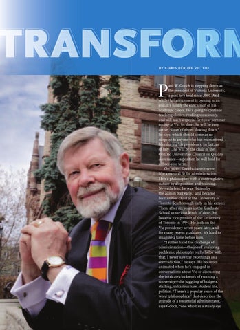 aul W. Gooch is stepping down as the president of Victoria University, a post he’s held since 2001. And while that assignment is coming to an end, it’s hardly the conclusion of his academic career. He’s going to continue teaching classes, reading voraciously, and will teach a special first-year seminar course at Vic. In short, he will be very active. “I can’t fathom slowing down,” he says, which should come as no surprise to anyone who has encountered him during his presidency. In fact, as of July 1, he will be the chair of the Ontario Universities Council on Quality Assurance—a position he will hold for a three-year term. On paper, Gooch doesn’t seem like a natural fit for administration. He’s a philosopher with a contemplative nature by disposition and training. Nevertheless, he was “bitten by the admin bug early,” and became humanities chair at the University of Toronto Scarborough early in his career. Then, after six years in the Graduate School as various kinds of dean, he became vice-provost of the University of Toronto in 1994. He took on the Vic presidency seven years later, and for many recent graduates, it’s hard to imagine a time before him. “I rather liked the challenge of administration—the job of analyzing problems; philosophy really helps with that. I never saw the two things as a contradiction,” he says. He becomes animated when he’s engaged in conversations about Vic or discussing the intricate clockwork of running a university—the juggling of budgets, staffing, infrastructure, student life, politics. “There’s a popular sense of the word ‘philosophical’ that describes the attitude of a successful administrator,” says Gooch, “one who has a steady eye