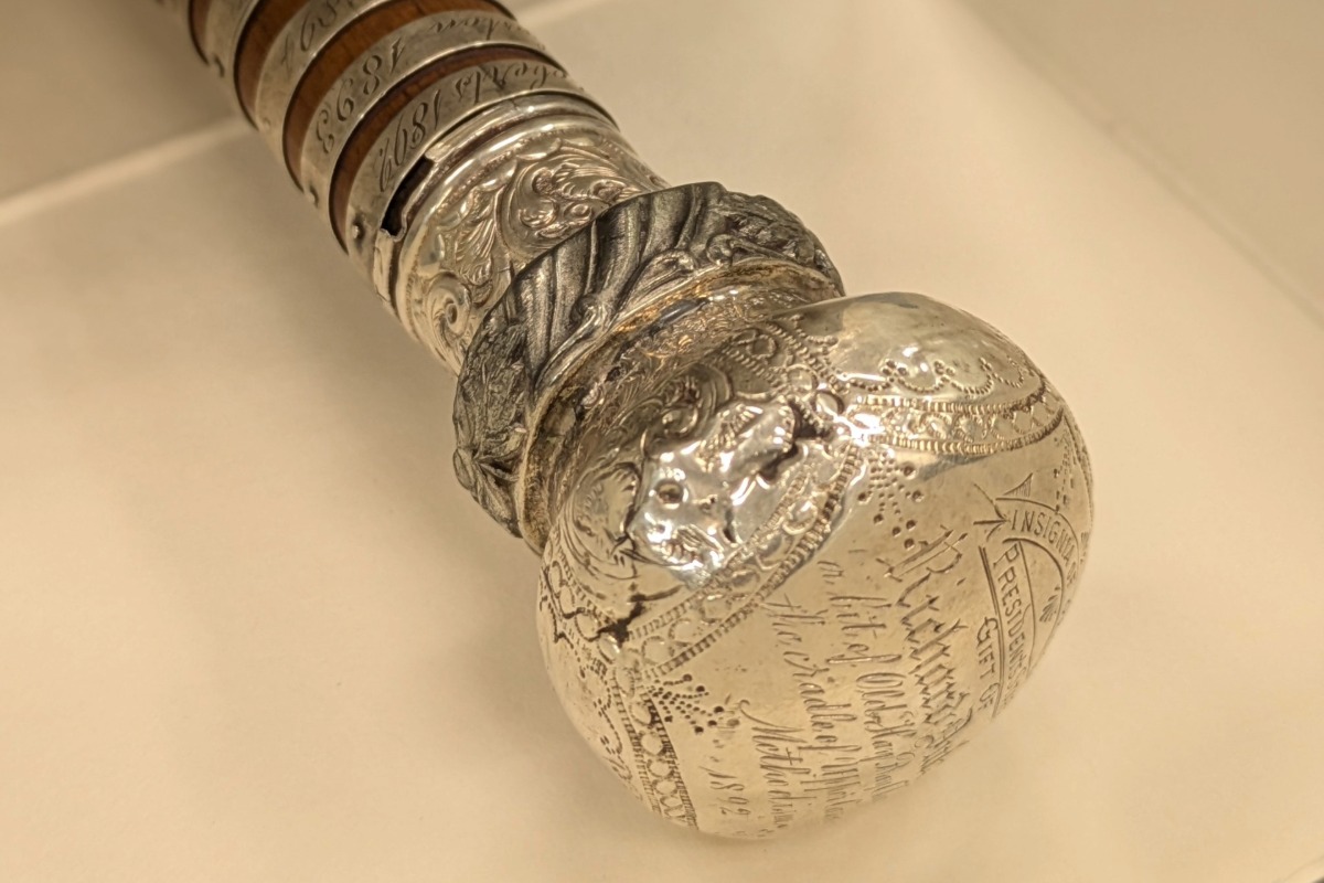 The cane was carved from wood from the Old Hay Bay Church in Adolphustown, Ont., the oldest surviving Methodist church in Canada. It was presented to the Bay of Quinte Conference, an administrative region for the Methodist Church, in 1892.