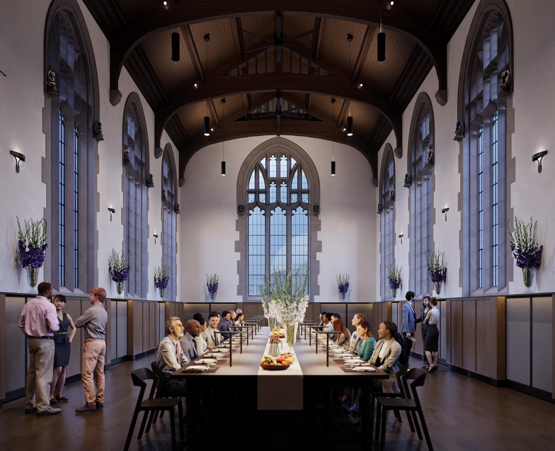 Inside, the design balances tradition with innovation. The original tables have been refurbished for modern use, complemented by new wood flooring in tones that echo the historic palette. Classic library lamps will provide focused lighting, while heating, cooling and power are discreetly integrated into custom wainscoting that wraps the room. This approach preserves the architectural character while meeting contemporary needs for comfort and connectivity.