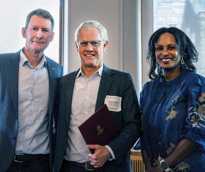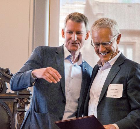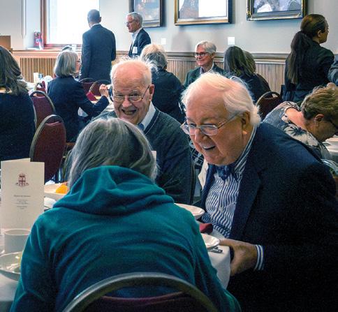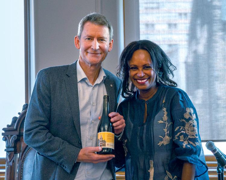 Chancellor Nick Saul Vic 9T0 received a special gift of Victoria University Chardonnay, made by Hinterland Winery, which was founded by Vic alumna Vicki Samaras Vic 9T8. This marked Saul’s final lunch as chancellor before his term expires in 2026.