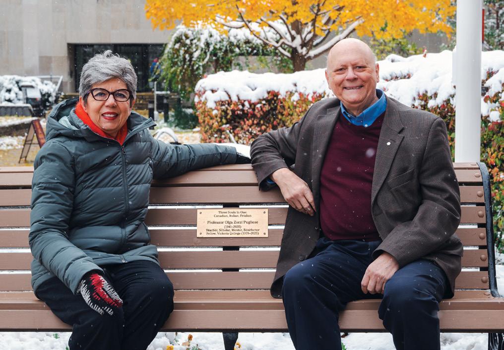 Luisa Giacometti (left) and Professor Konrad Eisenbichler sit on the memorial bench honouring Professor Olga Zorzi Pugliese.