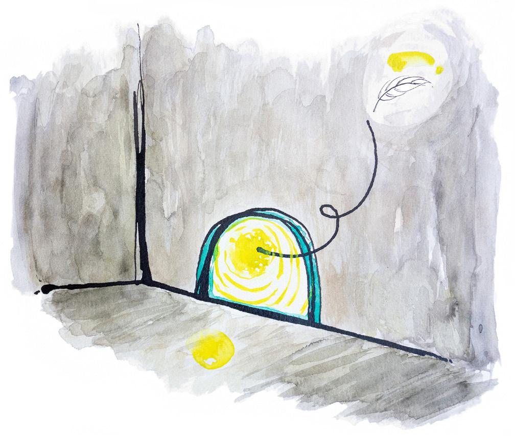 Mateo continua avanzando muy despacio hacia la burbuja, pero cada vez que intenta alcanzarla, esta se aleja como si estuviera jugando con él. Empieza a correr para cogerla y recuperar la pluma pero esta se mueve hacia la montaña y desaparece … sigue persiguiéndola, enfadado, y se encuentra con la entrada de una cueva.