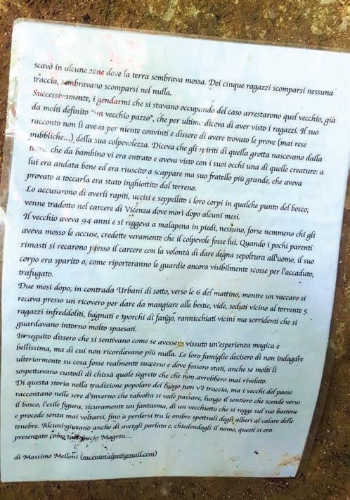 ti della contrada, una sera si incamminarono nel bosco verso la cavità. Forse entrarono intorno alla mezzanotte, secondo la testimonianza di un anziano signore. Il giorno seguente i genitori dei ragazzi, li cercarono dappertutto, in ogni angolo del bosco. I ragazzi sembrarono scomparsi nel nulla. I gendarmi accusarono l’anziano signore che li aveva visti, un certo Lucio Magrin, di 94 anni, che a malapena si reggeva in piedi, di averli rapiti, uccisi e seppelliti. Fu portato in carcere, dove morì. I parenti dell’uomo si recarono in carcere, ma il corpo era sparito.