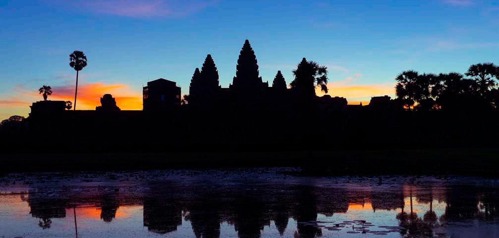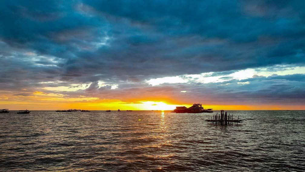 accompagnatore) sopra un'altura per gustare il tramonto che sta per fare capolino. Uno spettacolo avvolgente, così come l'alba del mattino e come in generale tutti i crepuscoli ai tropici. Ma la nostra Cambogia non è solo archeologica, non finisce lì. Il giorno seguente, sempre a orari antelucani, vogliamo esplorare la vasta regione del Lago Tonle Sap, non distante da Siem Reap, la cittadina che è base per chi poi visita lo smisurato sito di Angkor. Poche decine di chilometri, percorsi in un contesto "green", dato dal verde pastello delle risaie a perdita d'occhio proprio durante il periodo della maturazione delle piantine di riso: una qualità eccellente quella cambogiana, esportata in tutto il mondo, soprattutto in Francia (la Cambogia rimase colonia transalpina fino a poco prima della guerra in Vietnam). All'imbarcadero di Kampong Phluk saliamo su una rapida e agile imbarcazione che si districa tra naviri più lenti e, attraversato il villaggio con mercatini sulle sponde e con case palafitticole per contrastare il fiume che esonda durante la stagione delle piogge, raggiungiamo la vasta distesa del bacino idrico. Un enorme specchio d'acqua di cui non si vede la riva opposta e che è solcato da semplici pescatori in quanto ricchissimo di fauna ittica, sostentamento dei villaggi della regione. Tutta la giornata è dedita a navigare e a conoscere, comunicando a gesti ed espressioni facciali, gli abitanti lungo il Tonle Sap, molti sono i bambini dal sorriso spontaneo.
