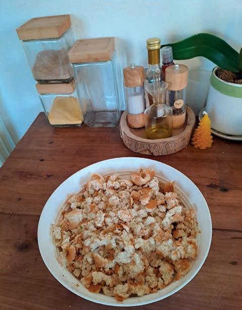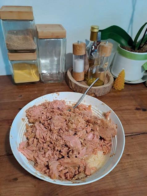 Ecco come procedere. Spezzettare e sbriciolare con le mani (ed eventualmente con l’ausilio di un coltello, se già molto secco) il pane raffermo. In una ciotola annaffiarlo con abbondante latte intiepidito, aggiungere dado vegetale in polvere e lavorare con le mani finché il liquido non sarà completamente assorbito. Se una volta lavorato, il pane risulta ancora asciutto o con pezzi duri, aggiungere latte o acqua, sempre non freddi. Lasciare riposare una mezzoretta. A questo punto, versare sul pane circa la stessa quantità di tonno ben sgocciolato dal proprio olio e sfaldato, formaggio grana grattugiato senza