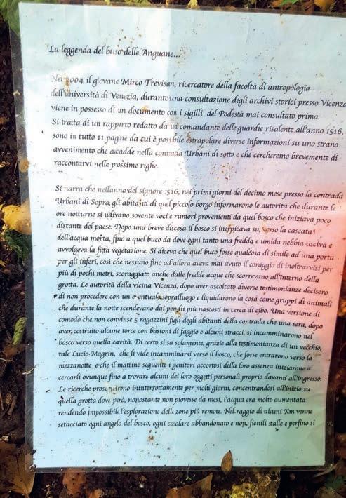 La leggenda che ha trovato Giuliano inizia più o meno così: “Si narra che nell’anno 1516, nei primi giorni del decimo mese presso la Contrada Urbani di Sopra, gli abitanti di quel piccolo borgo informarono le autorità che durante le ore notturne si udivano voci e rumori provenienti dal bosco”. Gli abitanti del posto pensavano che la grotta fosse una porta per gli Inferi e nessuno aveva il coraggio di entrarci. Le autorità dell’epoca di Vicenza fecero un sopralluogo e liquidarono la cosa come versi di gruppi di animali. In seguito 5 ragazzini, figli di alcuni residen-