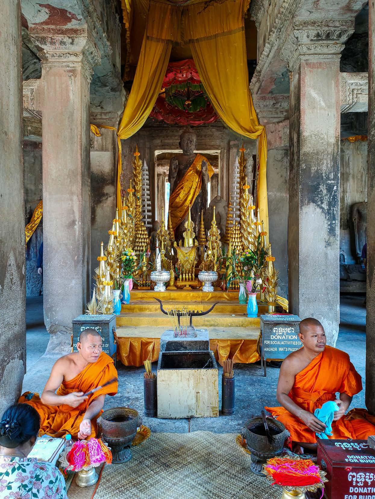 sua corte, fatta di momenti lieti, di ricchi banchetti, di feste con danze e musica fino al limite della licenziosità: a eccessi al limite del vizio fanno pensare le ballerine discinte, per non dire completamente senza veli, che sono istoriate lungo le pareti di uno dei cortili principali. Un intreccio di corpi sinuosi di giovani fanciulle in fiore che ammiccano coi loro accattivanti sorrisi, colte in un plastico movimento di danza. Danze ritmate che ci accolgono nella parte più interna: anche qui splendide fanciulle poco vestite, questa volta in carne e ossa, ci invitano a seguirle in arditi movimenti del corpo al suono di melodie per noi arcane. Come arcana è la litania di monaci buddhisti, che ci augurano armonia e serenità e che, alla fine della loro nenia, ci impartiscono una benedizione volta a evocare la protezione delle forze spirituali dell'universo. Un'unione di profumi (d'incenso, soprattutto) e di colori, di musiche antiche e di sfarzose architetture che ci accompagna nel tra-