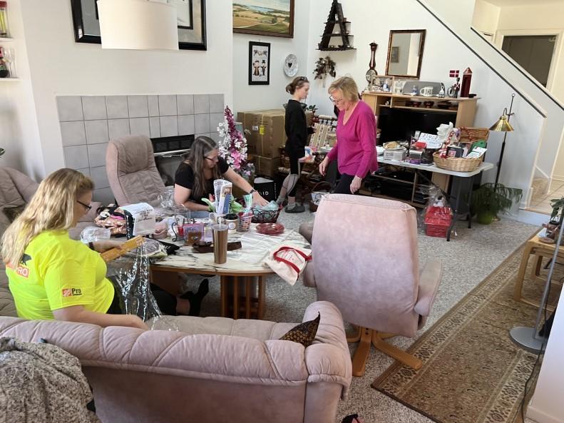 In February, our lodge then busied themselves with the preparations for the upcoming DAAC Fastelavn celebration and Dagmar Lodge’s Winter Luncheon, held March 9th. Fourteen Danish Sisters and one Mister Sister met at Bente and Lars Rasmussen’s house the week before to bake Fastelavnsboller and other sweet treats, as well as to organize gift baskets for the winter luncheon raffle. Twenty-two gift baskets were created with the help of the two youngest attendees, Eily (15) and Alexandra (11). Jean Jackson, lodge president, worked closely alongside Stacy Nelson’s daughter and Tracey Nielsen’s granddaughter, alongside other members.