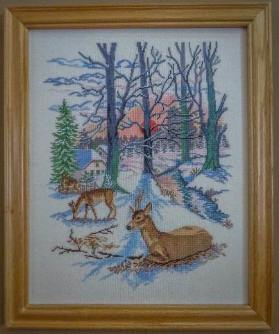 A beautiful framed cross stitch embroidery picture of a peaceful deer scene designed by Eva Rosenstand and lovingly stitched by Annalisa Bhatia of Lodge #1 for the 2023 DSS National Convention Raffle. The size is approximately 19"x23" in an oak frame with glass. Actual picture is shown.
